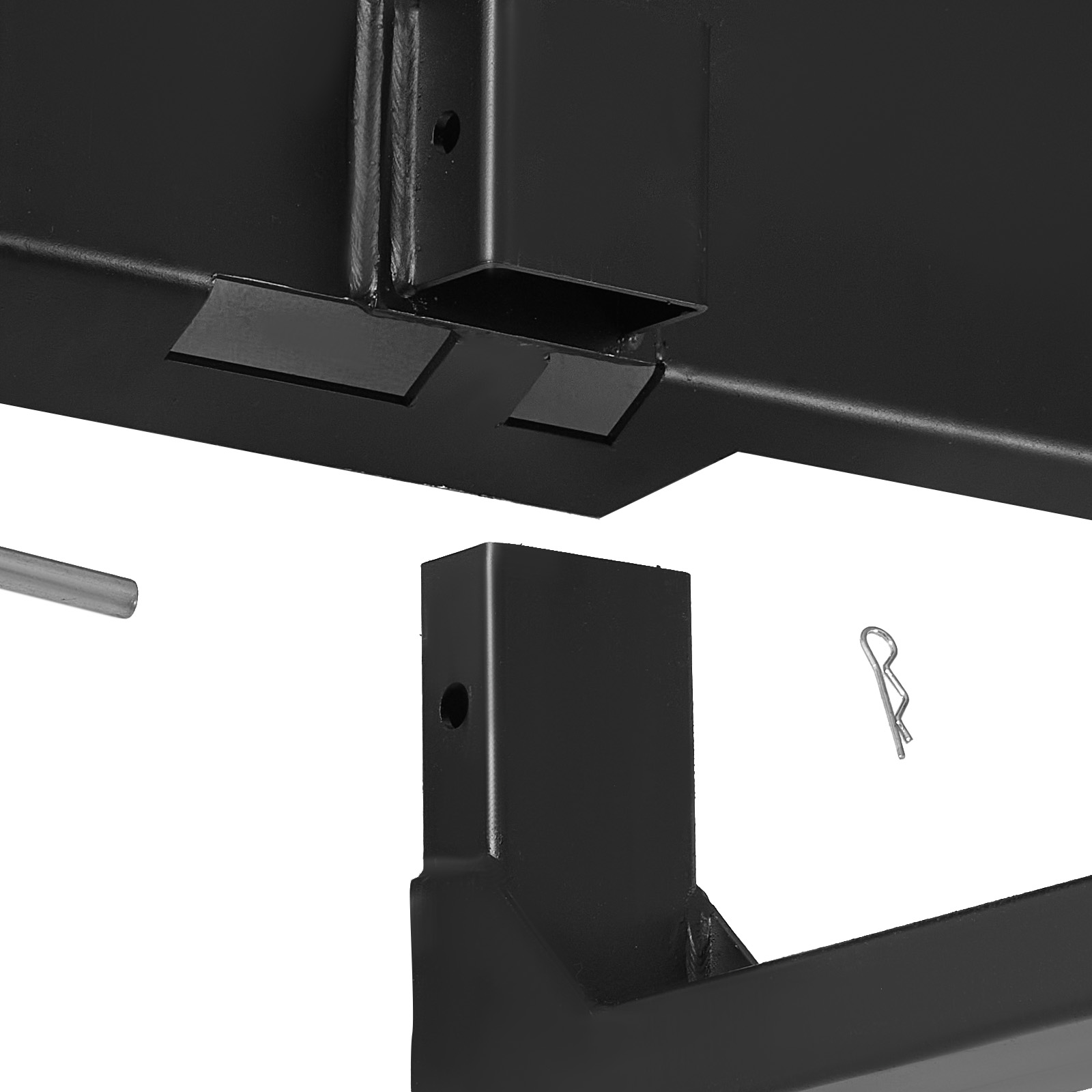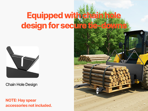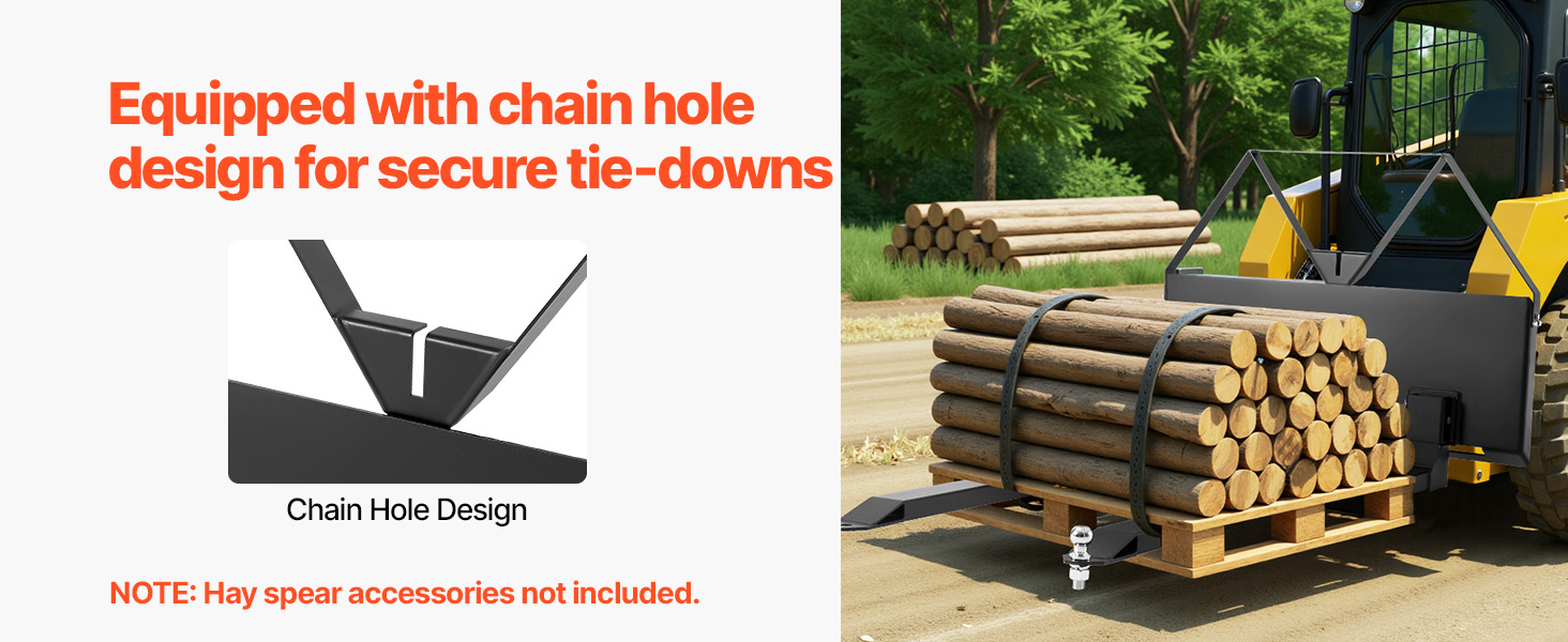 - Chain Hole Design: The mounting plate has chain holes, so you can easily secure items with ropes or chains. This design of our quick attach pallet forks boost stability and keep items from falling during transport—security first