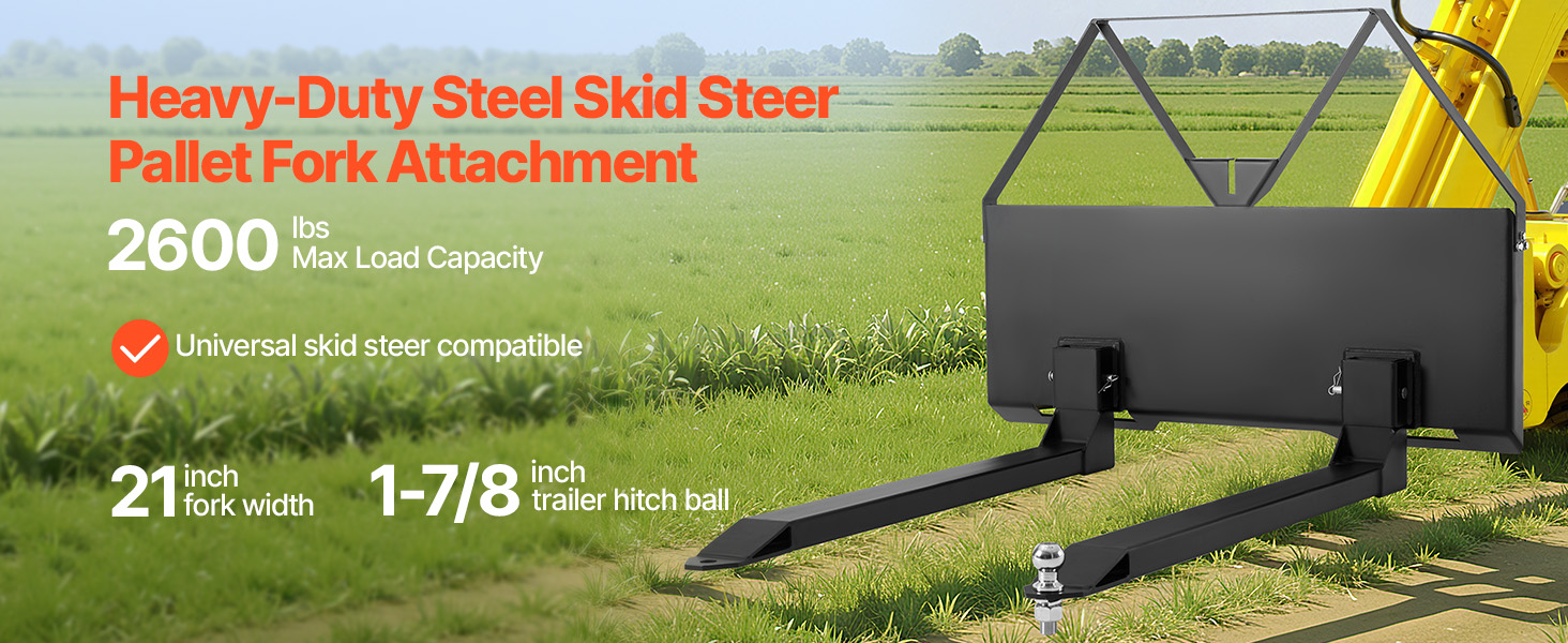 Heavy-duty Skid Steer Pallet Forks with Trailer Ball: 2600 lbs Load Capacity