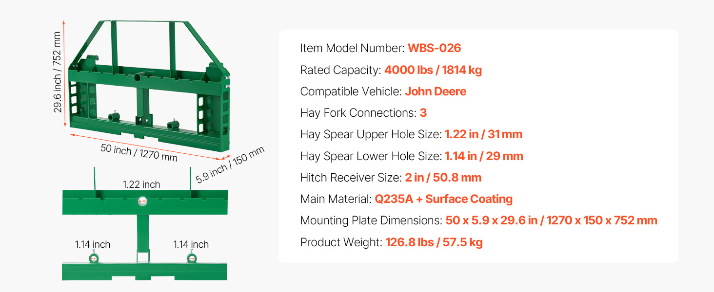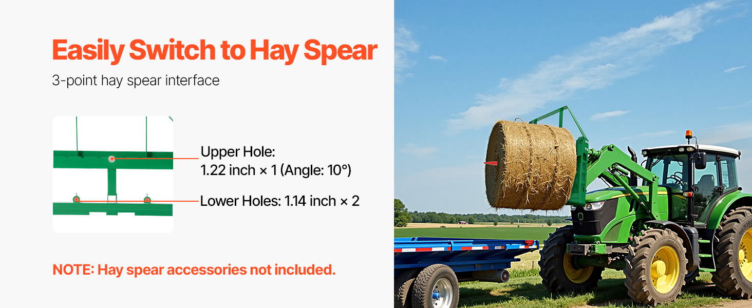 - Transform into a Hay Spear: With 3 hay spears connections (1.22-inch upper hole, 1.14-inch lower holes), this pallet fork frame attachment makes hay bale hauling a breeze! (Hay spears sold separately) Save time and energy while getting the job done fast