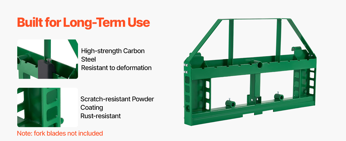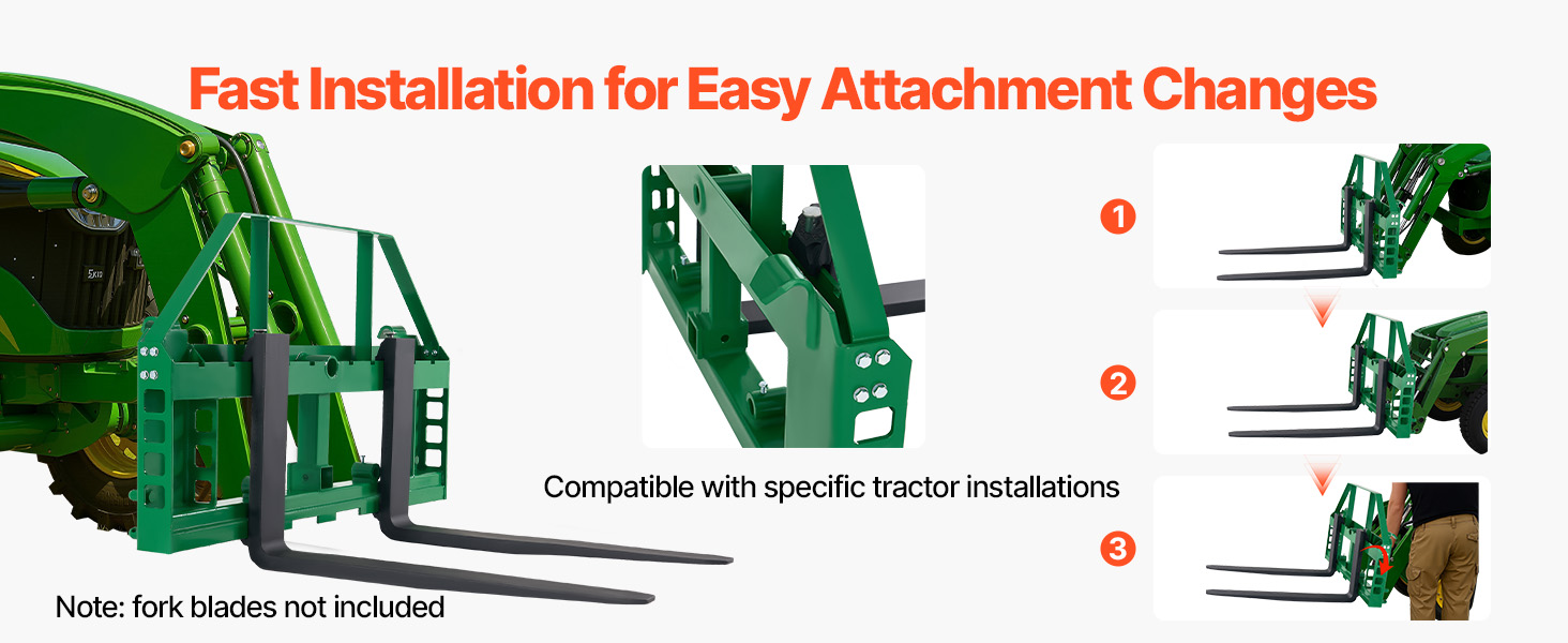- Quick & Easy Installation: Designed specifically for John Deere tractors, this skid steer pallet frame attaches easily with no tools needed. Simply slide it onto the tractor, lock it in place, and you're ready to work efficiently with minimal effort