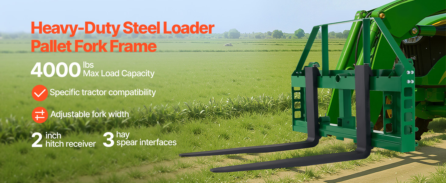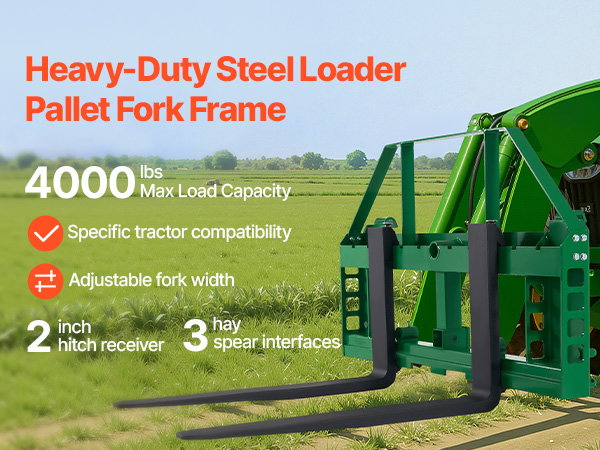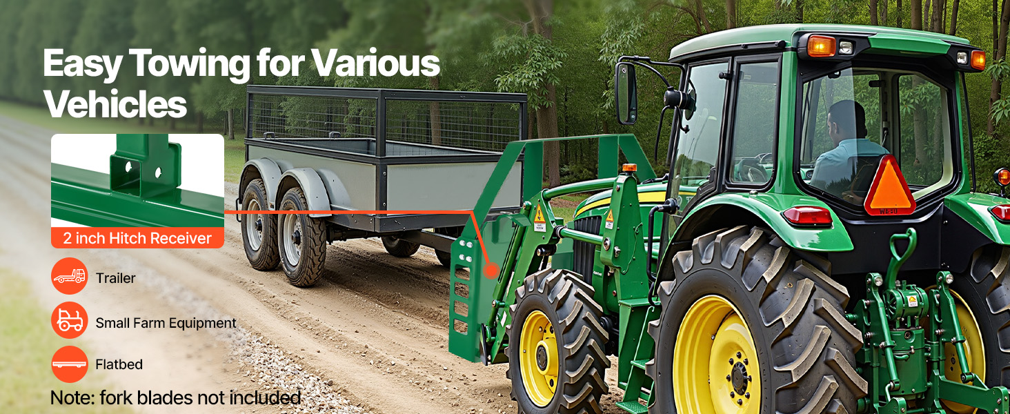 - Towing Made Simple: Equipped with a 2-inch hitch receiver, this skid steer pallet fork frame allows easy connection to 2-inch trailer balls for towing trailers, flatbeds, and more. Ideal for expanding your loader or tractor's capabilities. (Trailer ball sold separately)