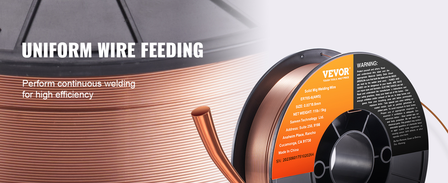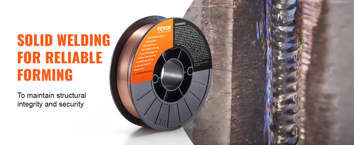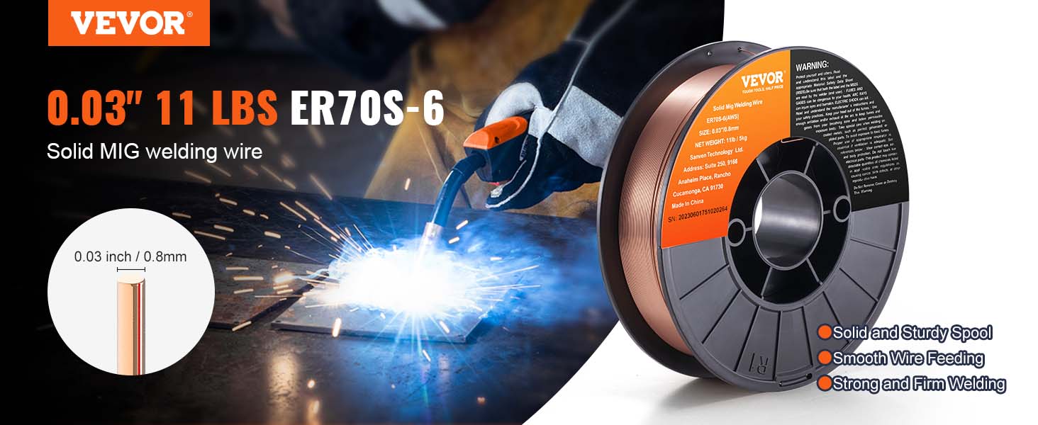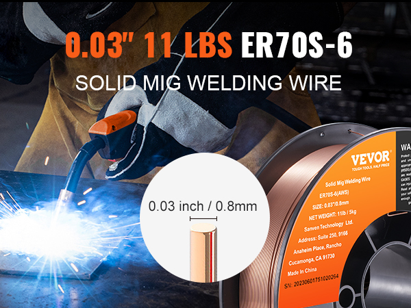 - 0.030" 11LBS Solid MIG Welding Wire: VEVOR 0.030" 11LBS ER70S-6 solid MIG welding wire is suitable for a wide range of carbon steel applications. Compared to other standard MIG welding wires, it combines higher levels of manganese and silicon, creating high-quality welds even when working with dirty, oily, or rusted steel.