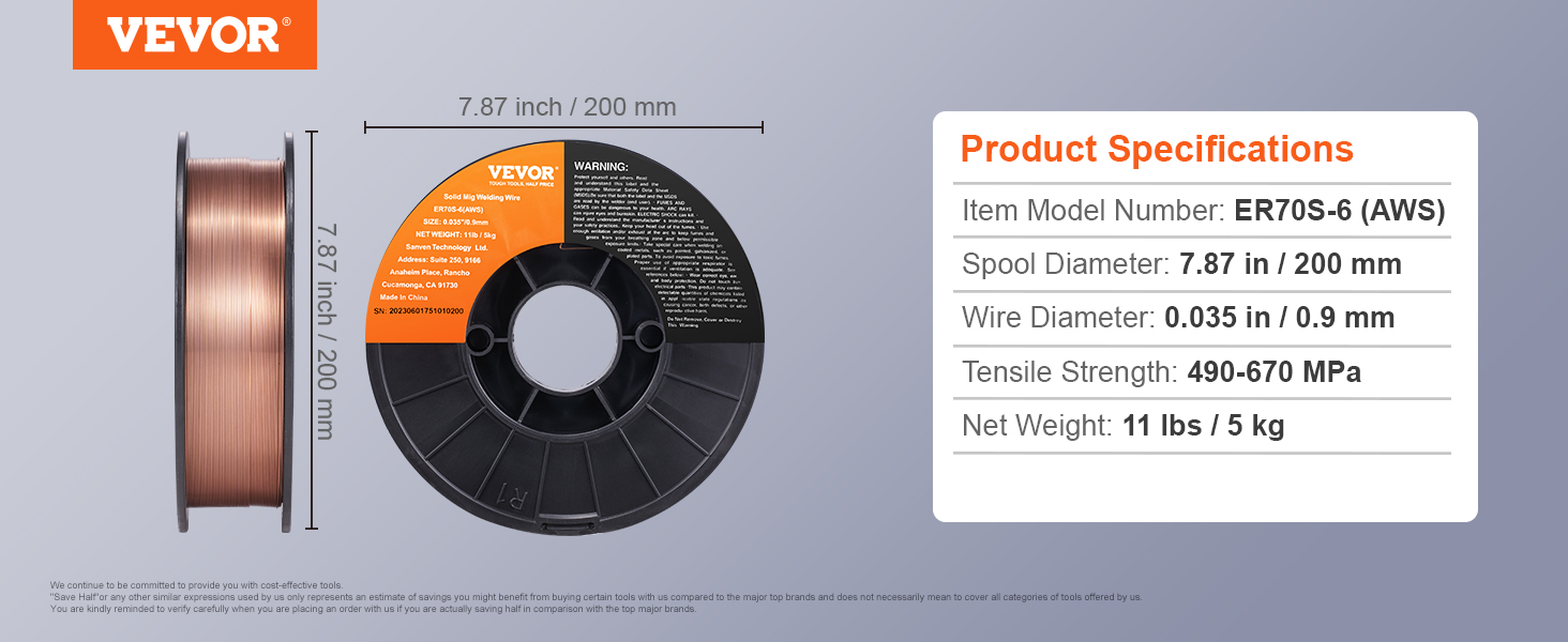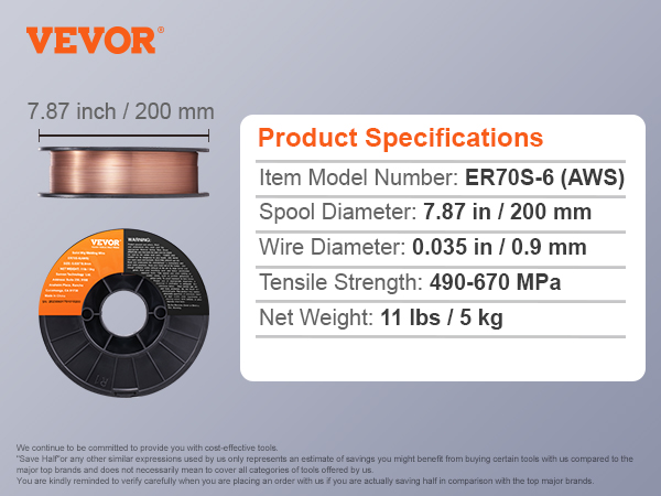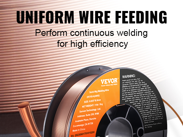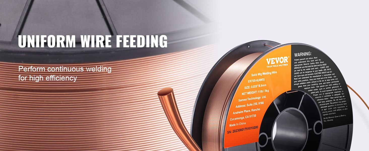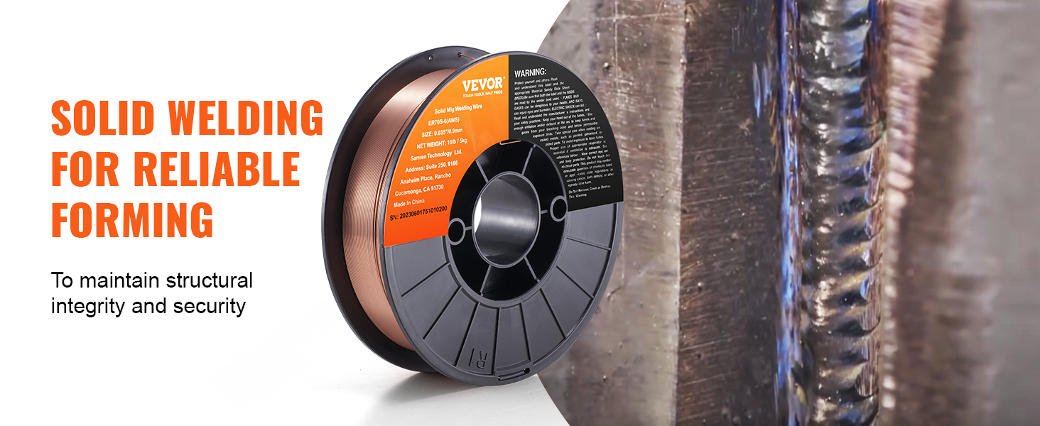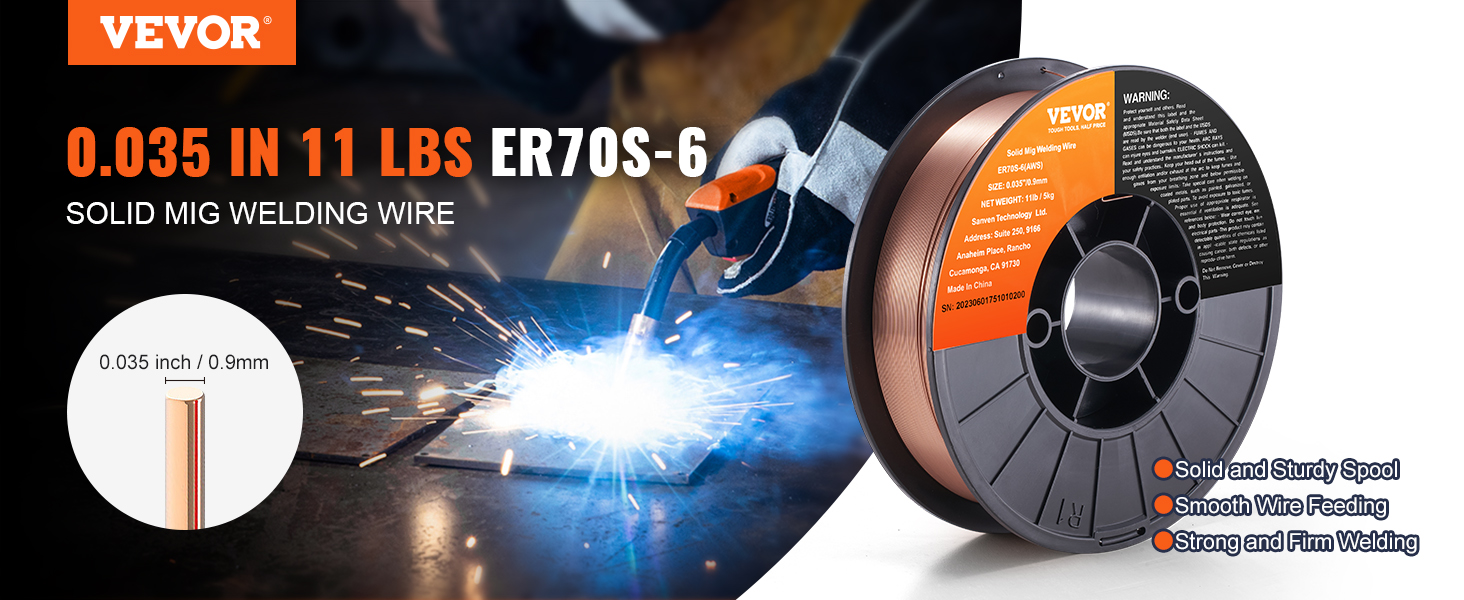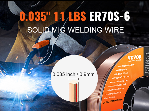 • 0.035" 11LBS MIG Welding Wire: VEVOR 0.035" 11LBS ER70S-6 solid MIG welding wire is suitable for a wide range of carbon steel applications. Compared to other standard MIG welding wires, it combines higher levels of manganese and silicon, creating high-quality welds even when working with dirty, oily, or rusted steel.