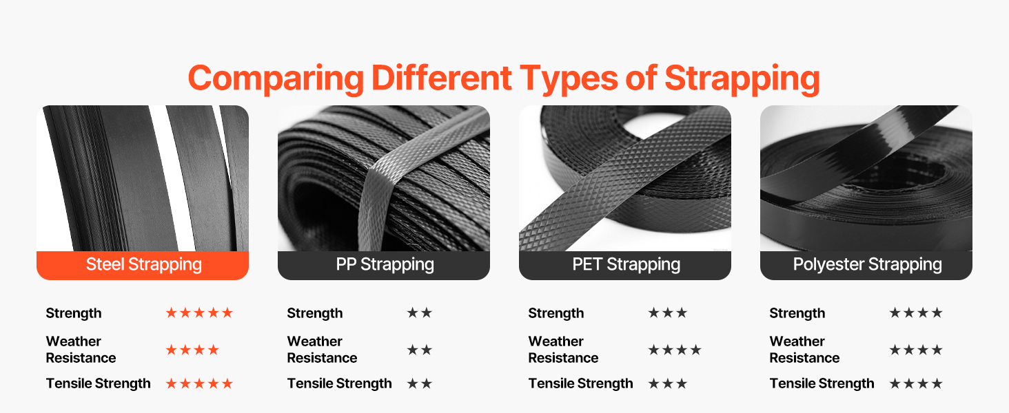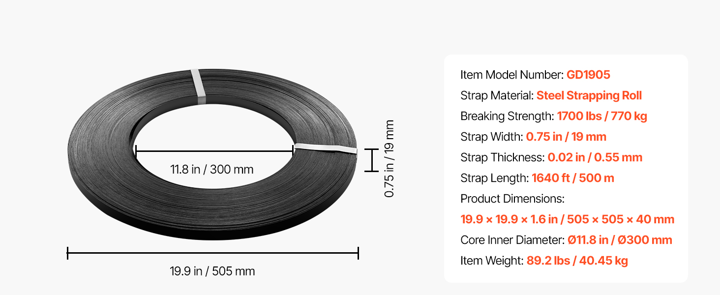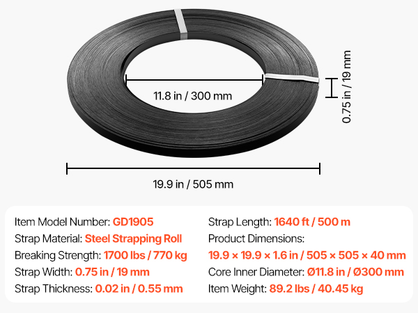 - 1640 ft of Flexible Strapping: This steel strapping roll comes in 1640 ft (500 m), with 0.75 in (19 mm) width and 0.02 in (0.55 mm) thickness. It's compatible with VEVOR pneumatic strapping machines and carts for easy, hassle-free use