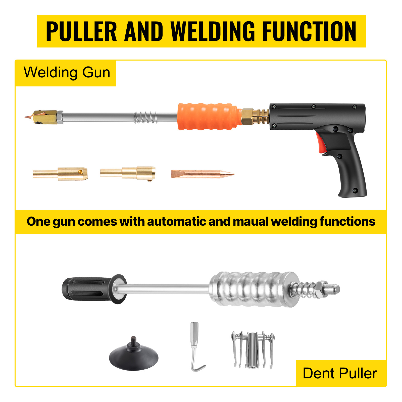 - Versatile Application: Contains 7 different types of studs, suitable for various dent sizes and types. One high performance gun comes with both manual and automatic welding functions, easily handling larger dents on flat or curved automotive body panels