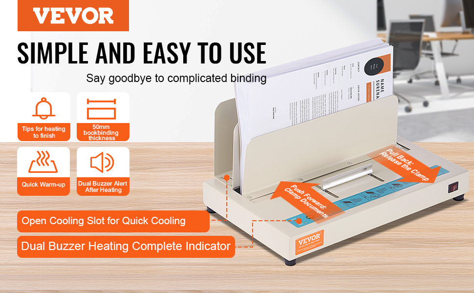 - Simple to Use: No need for punching holes, just a single button to bind. The manual clamping rail prevents paper from falling out, and the open cooling slot ensures rapid cooling. Make document binding more secure and efficient with our thermal binding machine!