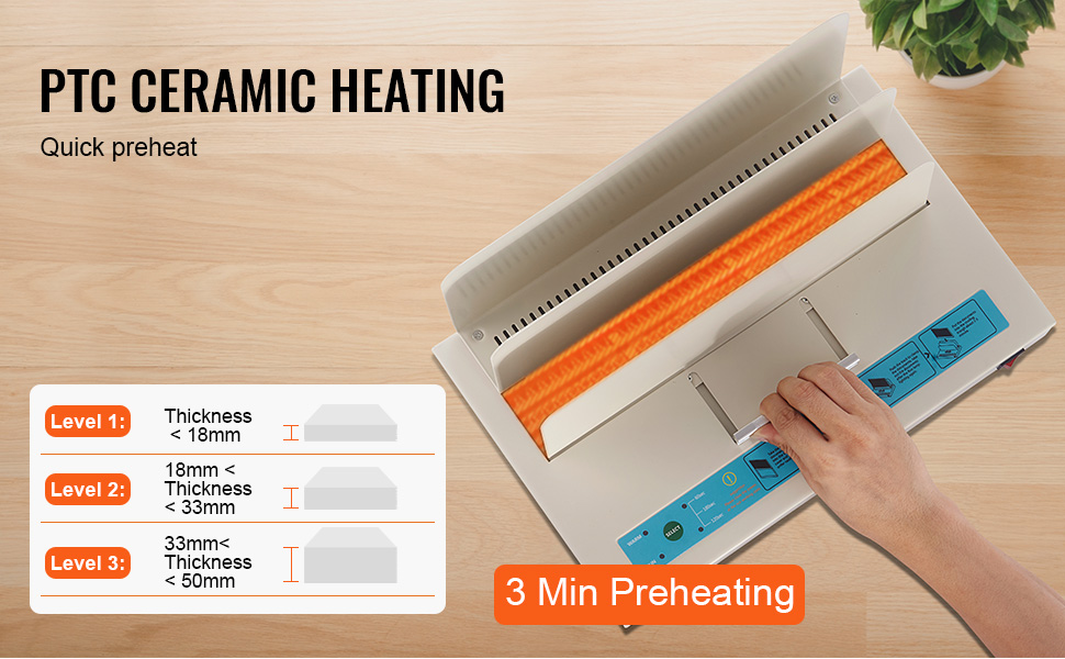 - Time-Saving Operation: Equipped with PTC ceramic heating technology, reaching a high temperature of 140℃. Preheating takes only 3 minutes, allowing you to bind documents quickly. Three adjustable time settings meet different thickness needs.