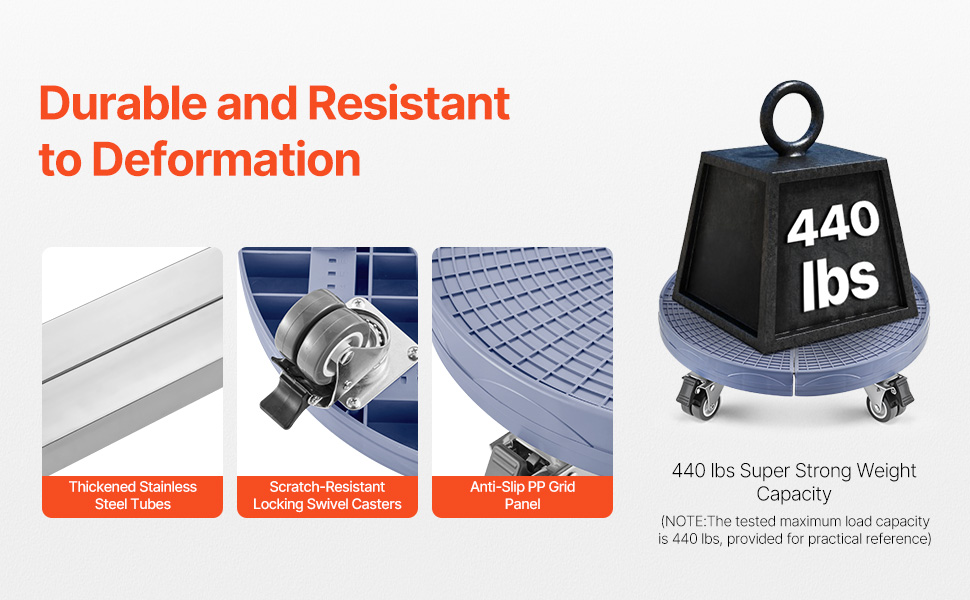 Reinforced PP panel, stainless steel frame and dual-row locking wheels (400lbs capacity) for easy transporting. Anti-slip grid pattern ensures stability during transport.