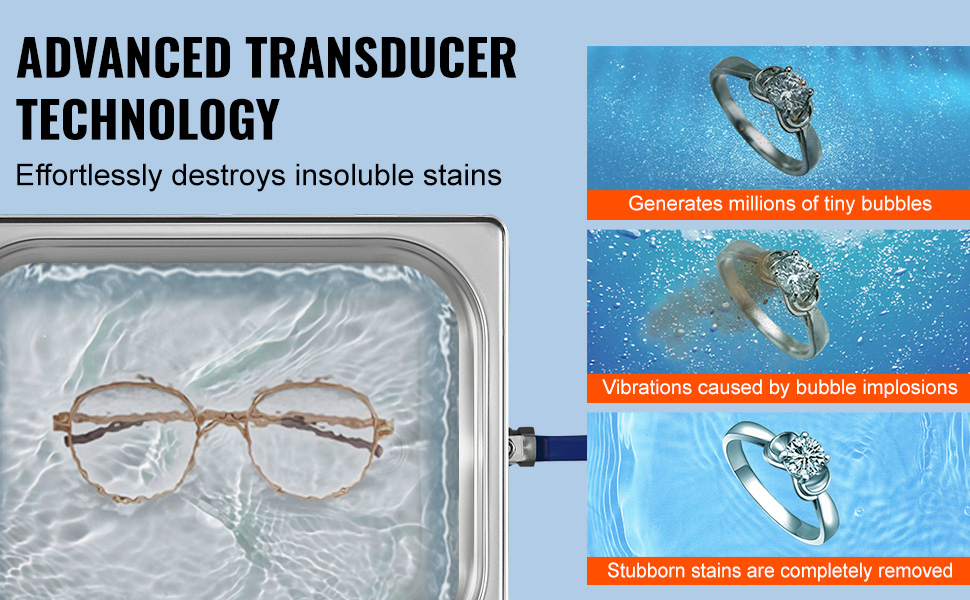 - Advanced Transducer Technology: Our ultrasonic jewelry cleaner features four advanced transducers equipped with sandwich-type piezoelectric transducers. Scientifically designed for enhanced cleaning efficiency and quality, it refreshes your items, whether for everyday use or professional cleaning needs.