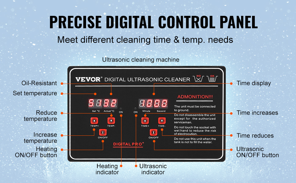 - Digital Control Panel: The digital control panel enables convenient operation, allowing precise adjustment of cleaning time and temperature. Multiple modes are tailored to specific item requirements, streamlining the cleaning process and enhancing overall cleaning efficiency.