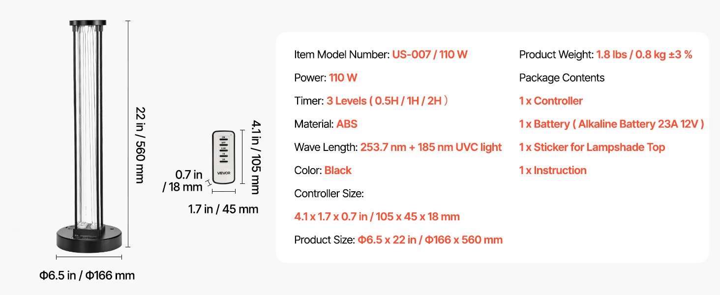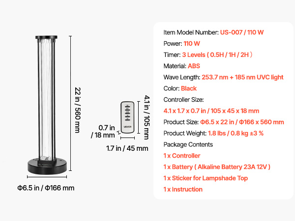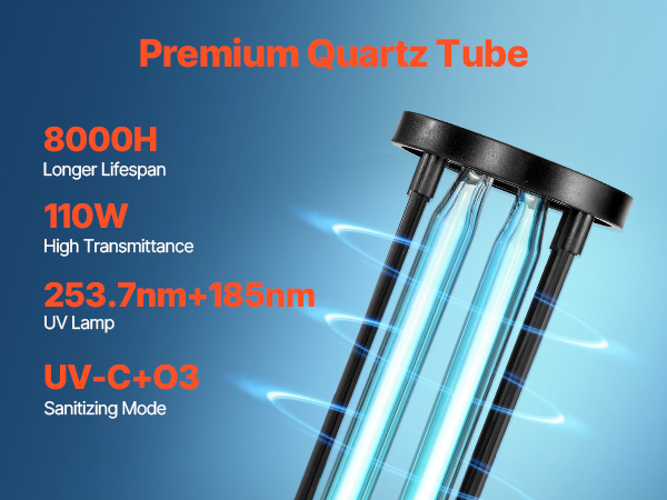 The UV-C light is made with high-transmission quartz and engineered for performance. The 253.7nm + 185nm UV-C and ozone dual technology provides wide-area coverage with 110W of power and up to 8,000 hours of reliable use.