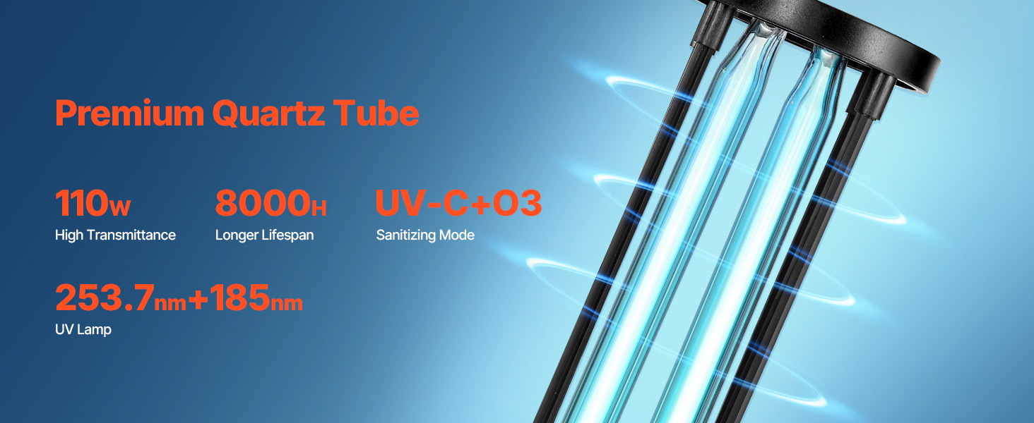 • Reliable Premium Quartz Tube: The quartz tube delivers dual disinfection with 253.7nm + 185nm UV-C rays and ozone technology. With a 110W output and 8000-hour lifespan, it cleans large areas efficiently, ensuring energy-efficient performance.