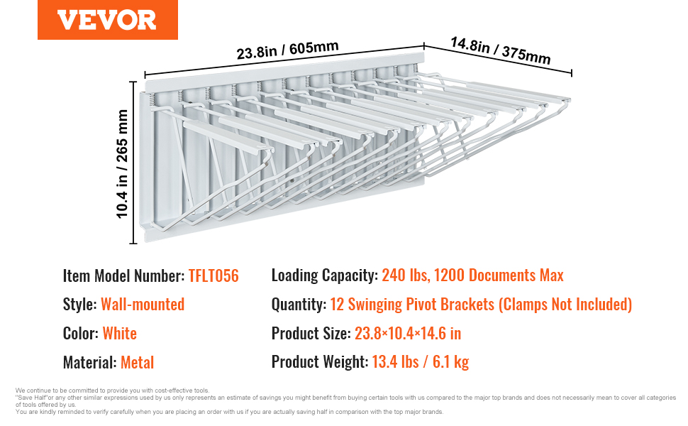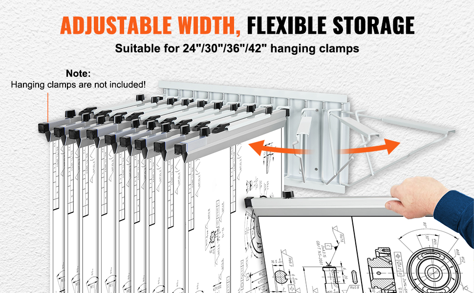 - Adjustable Width Design: Our blueprint rack features pivot brackets that swing left and right for ease of use. It can hold up to 12 hanging clamps (not included), suitable for hanging 24", 30", 36", or 42" document clamps.