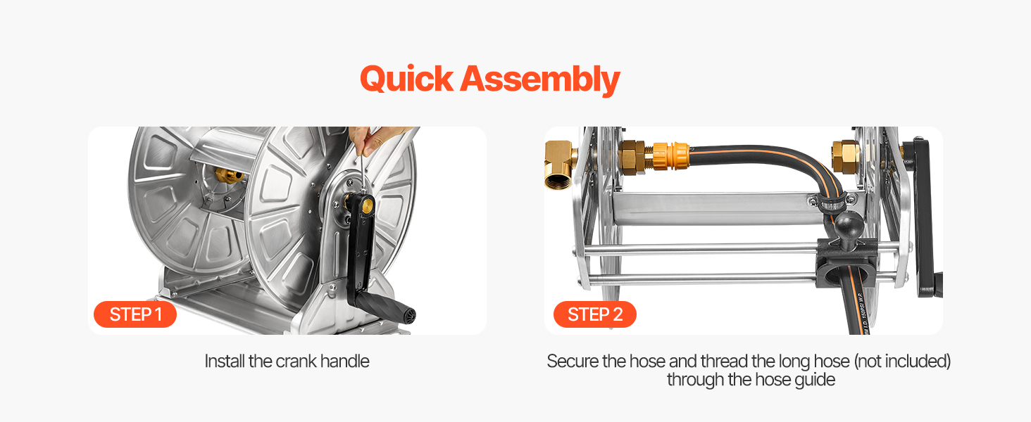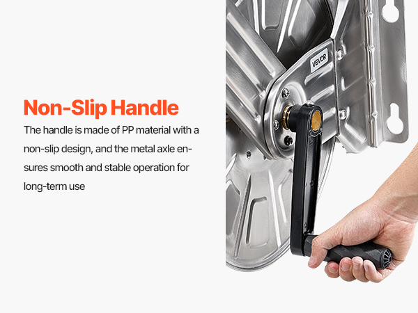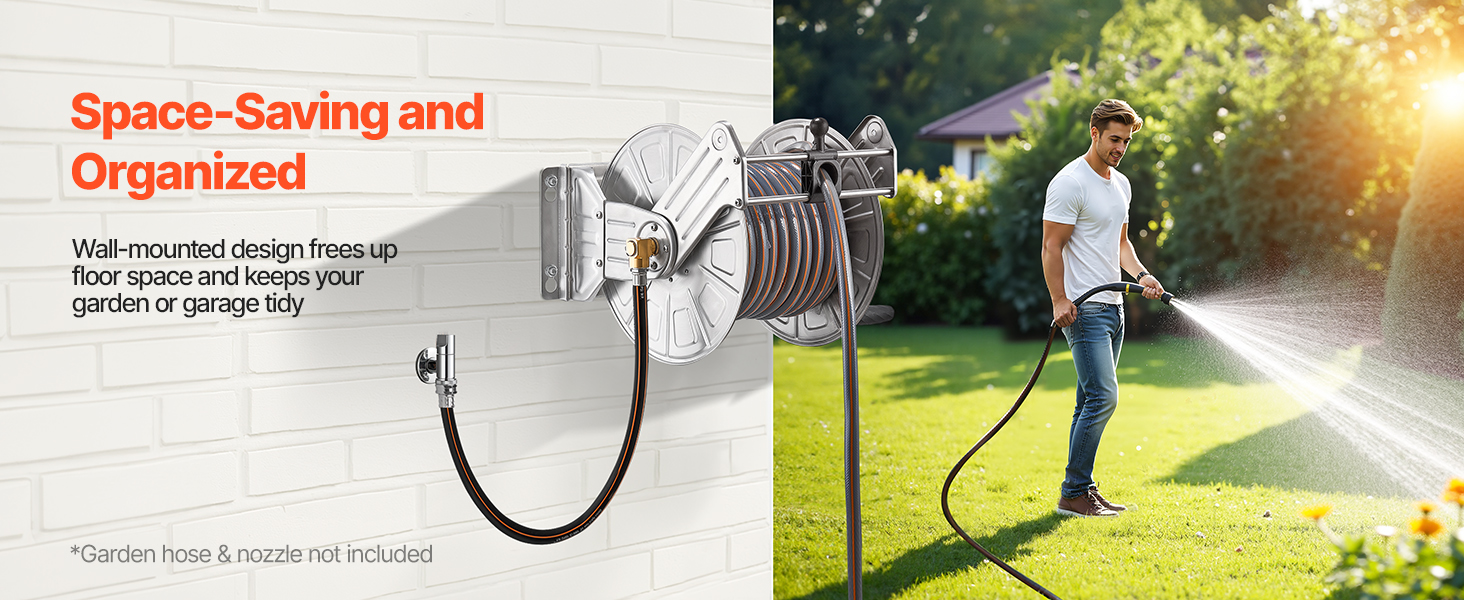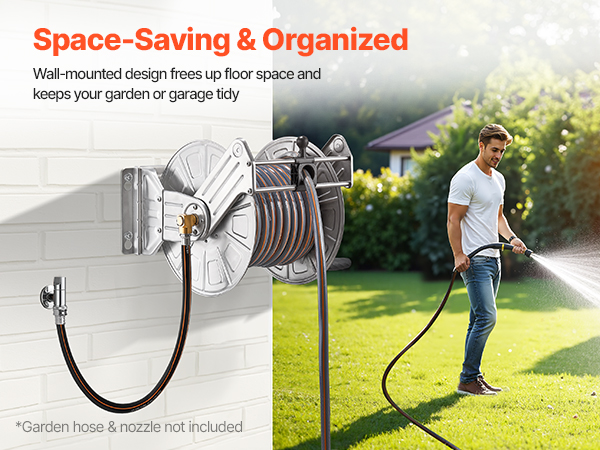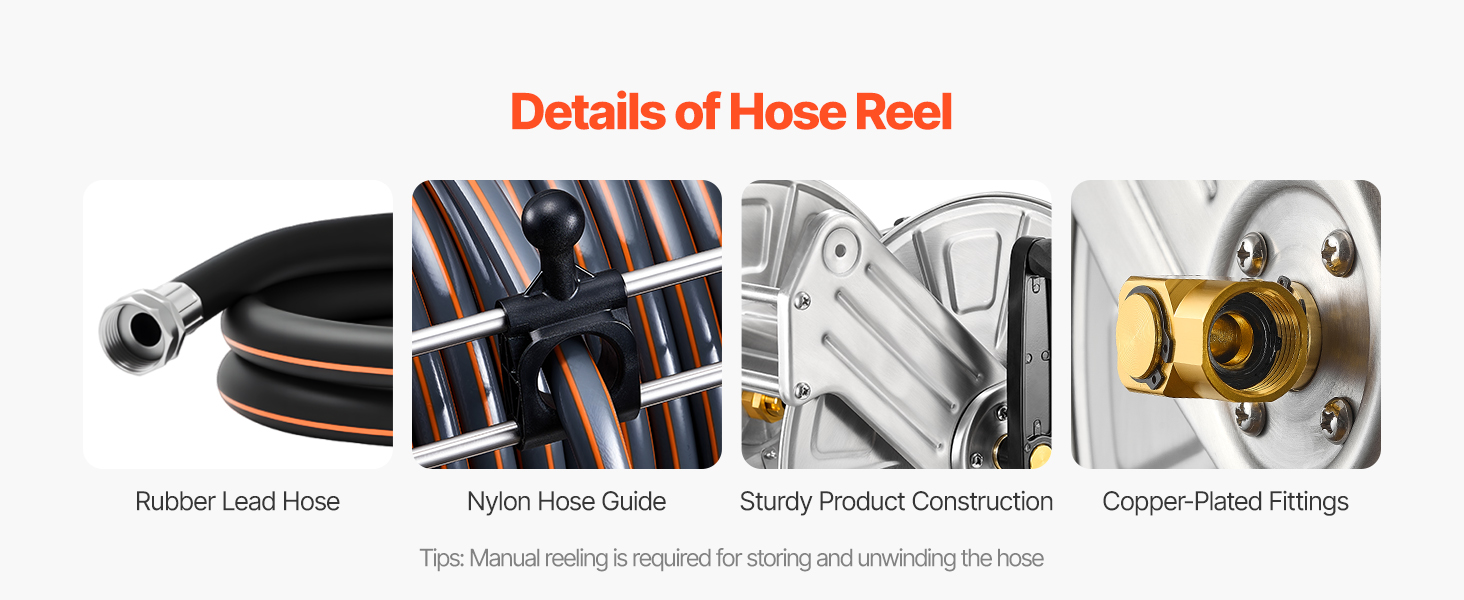 - Space-Saving Design: The included sturdy bracket (304 stainless steel angle iron) and anti-loosening screws, ensure the hose reel is securely mounted on the wall. It saves floor space and keeps the hose neatly stored, reducing clutter.