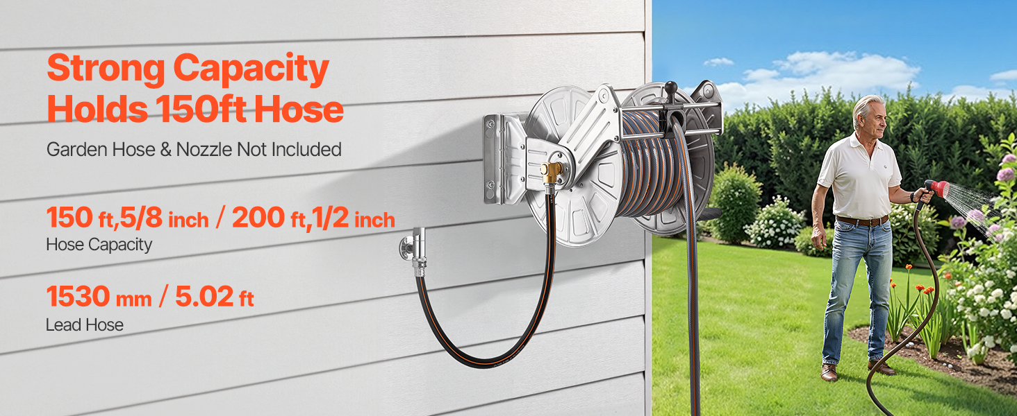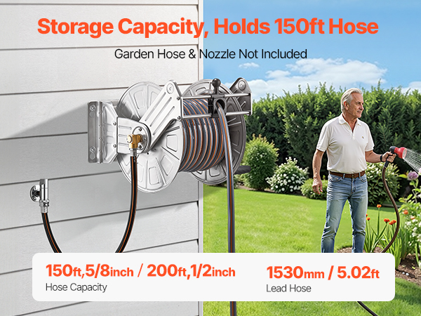 - High Capacity Storage: This garden hose reel is designed to store hoses up to 150 ft, 5/8 in (hose not included), and comes with a 5-ft lead hose, making it ideal for most home and garden needs. With sufficient length, it is suitable for watering garden or washing your car.