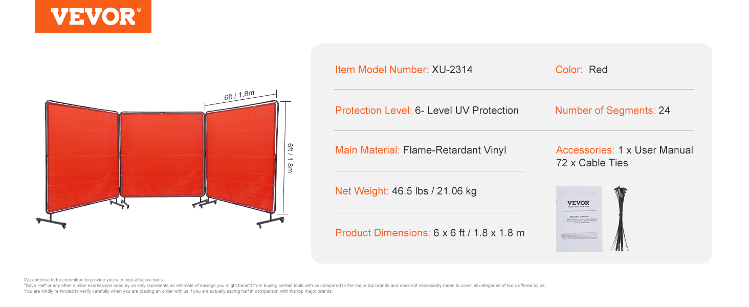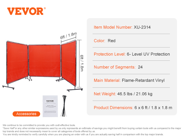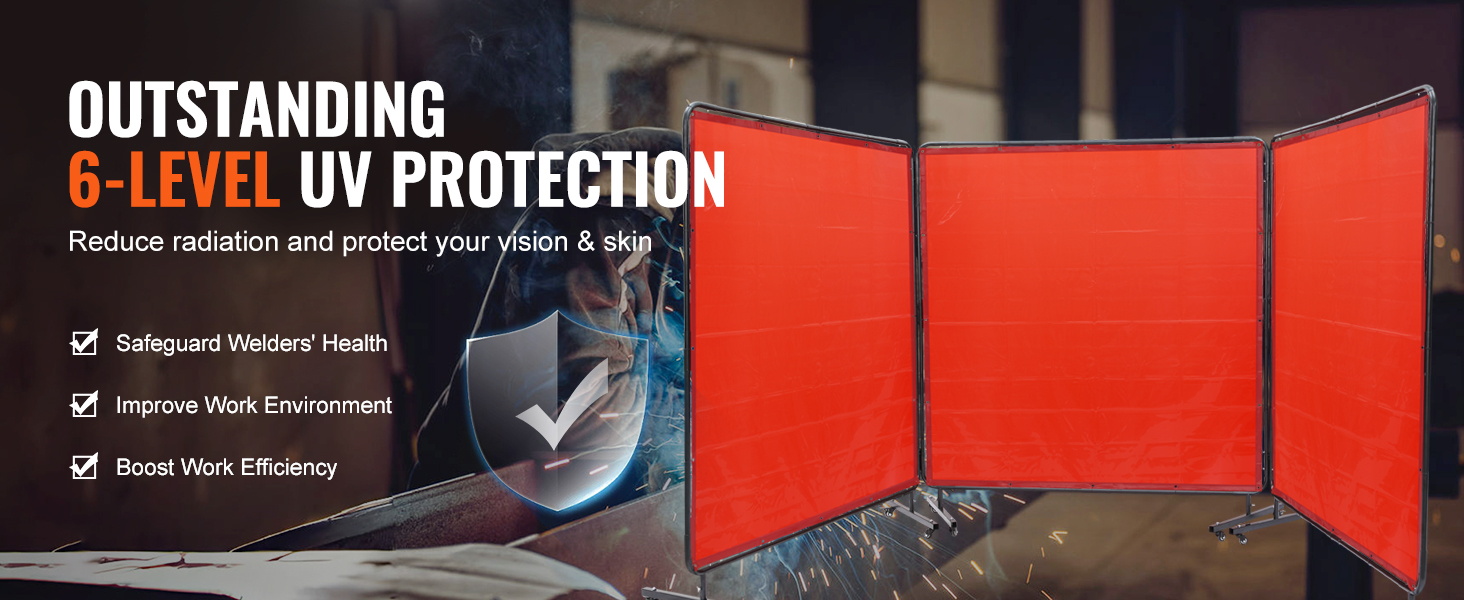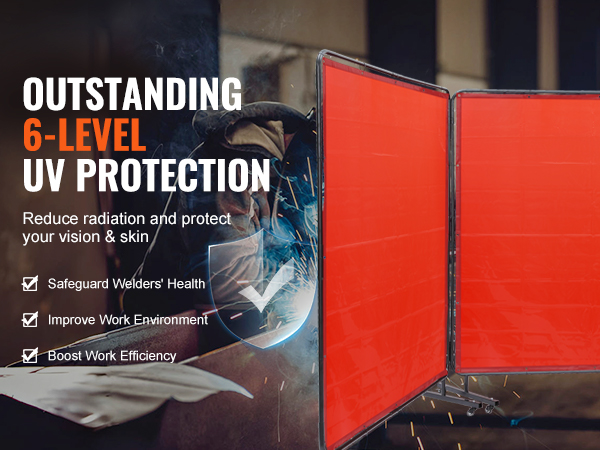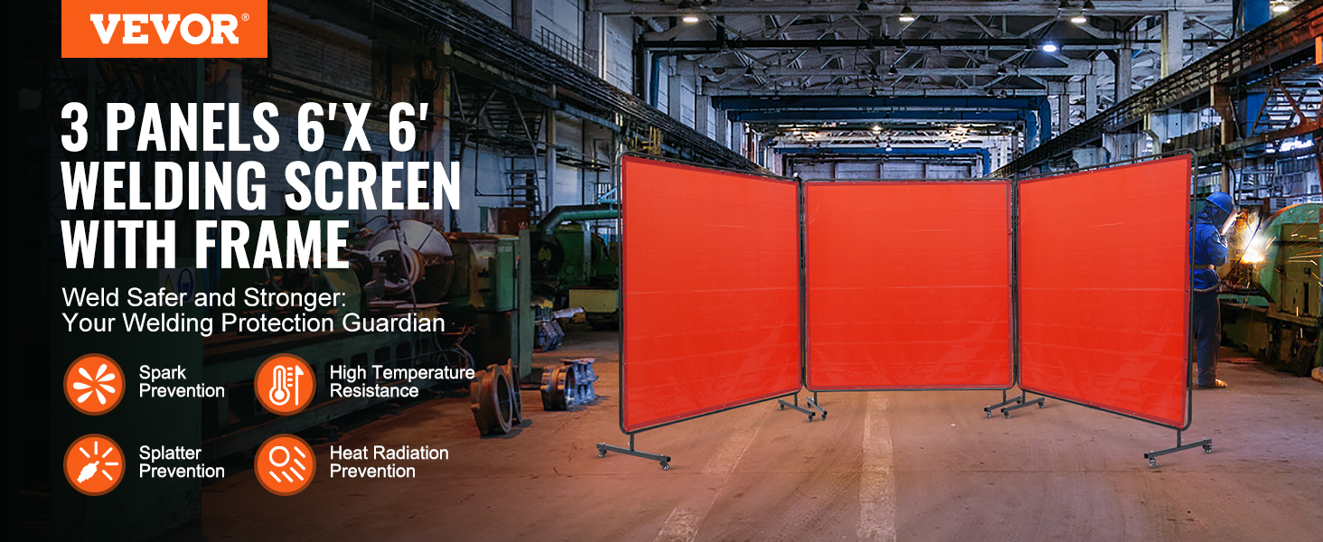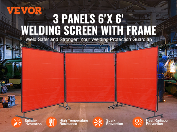 - Super Large Coverage: With 3 panels 6' x 6' spacious protective size, VEVOR welding screen with frame provides board and maximum protection for your workspace and welding projects. Keep welding area isolated and minimize the impact of sparks, splatter, UV flash, and heat radiation.