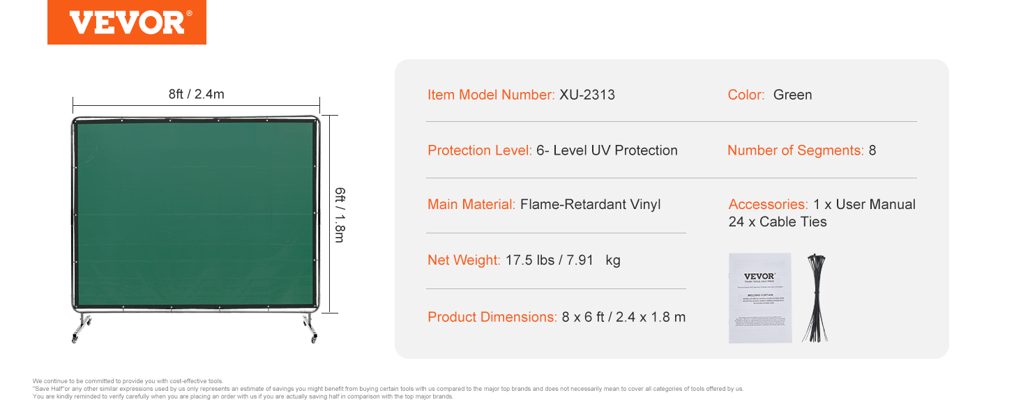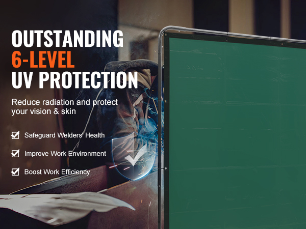 - Super Large Coverage: With a spacious 6'x 8' protective size, VEVOR welding screen with frame provides board and maximum protection, minimizing the impact of sparks, splatter, UV flash, and heat radiation. (FRIENDLY NOTE: The welding screen is actually dark green and appears green under bright light. Due to lighting effects, the color of the images on the page may differ slightly from the actual product.)