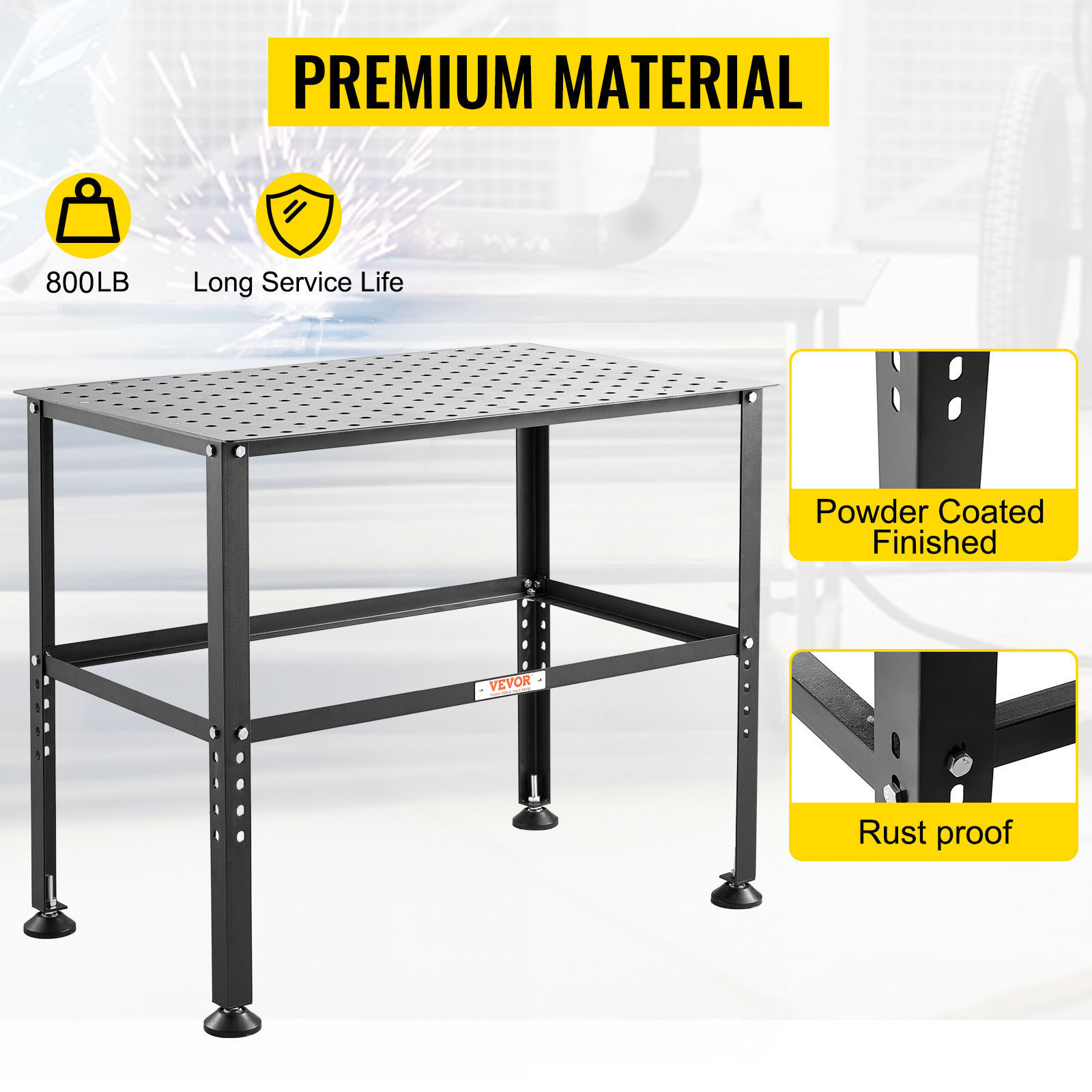 - Strong Weight Capacity: Crafted with a sturdy carbon steel frame, the welding table supports up to 800 lbs load-bearing. High-strength frame delivers superior weight capacity, wear and rust prevention, providing stable support for your welding projects.