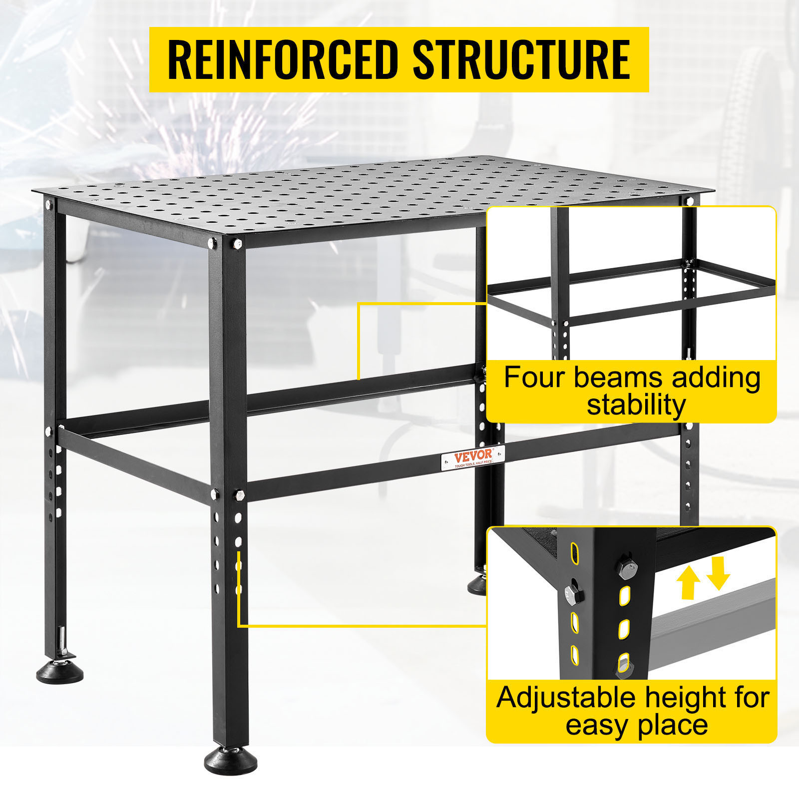 - Stable & Reliable: Stability is key to welding quality. Our welding work bench features 4 adjustable anti-slip foot pads, designed to adapt to uneven floors. Combined with sturdy beams for added support, giving you a reliable foundation for your welding tasks.