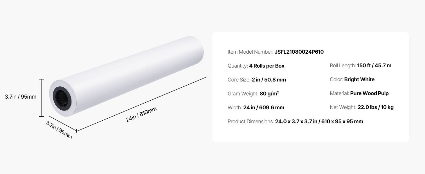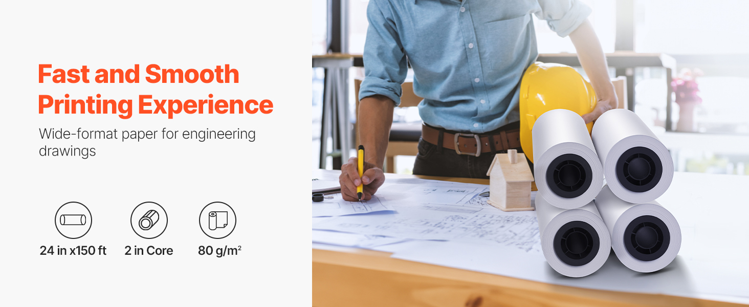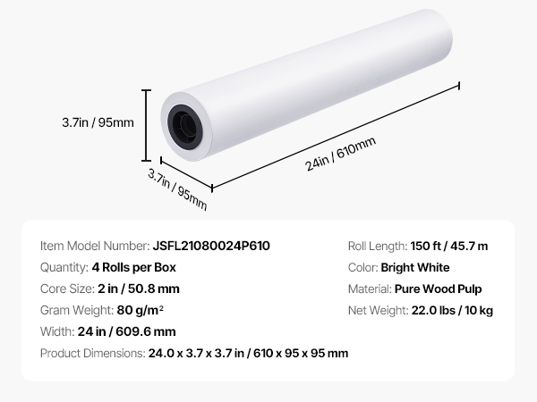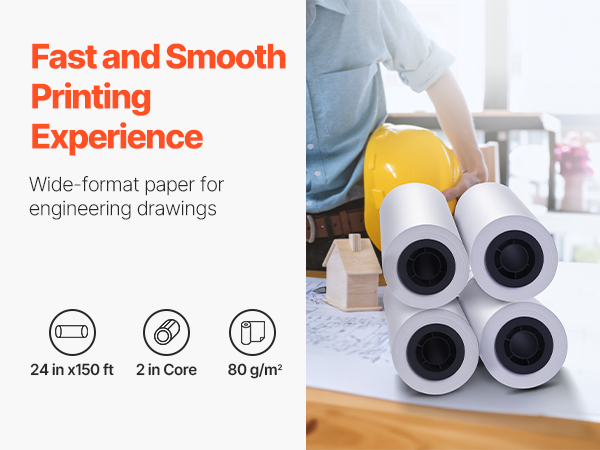- Standard Size Rolls: This wide-format paper comes in a box of four rolls, each with a width of 24 inches (609.6 mm) and a total length of 150 feet (45.7 m). It provides precise, continuous printing results ideal for large-scale engineering drawings and architectural blueprints. The 2-inch core fits most standard plotter printers.