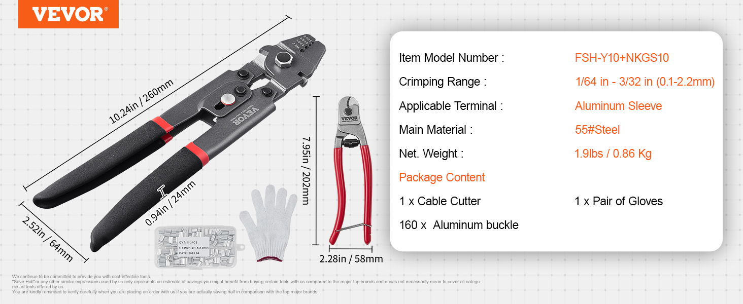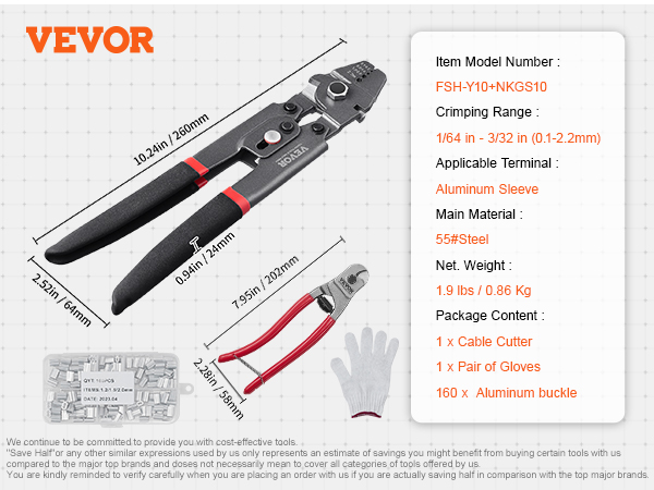 - What You Get: This wire crimping tool comes with 1 x cable cutter, 1 x pair of gloves, and 160 x aluminum sleeves. The complete accessories ensure secure and convenient operation.