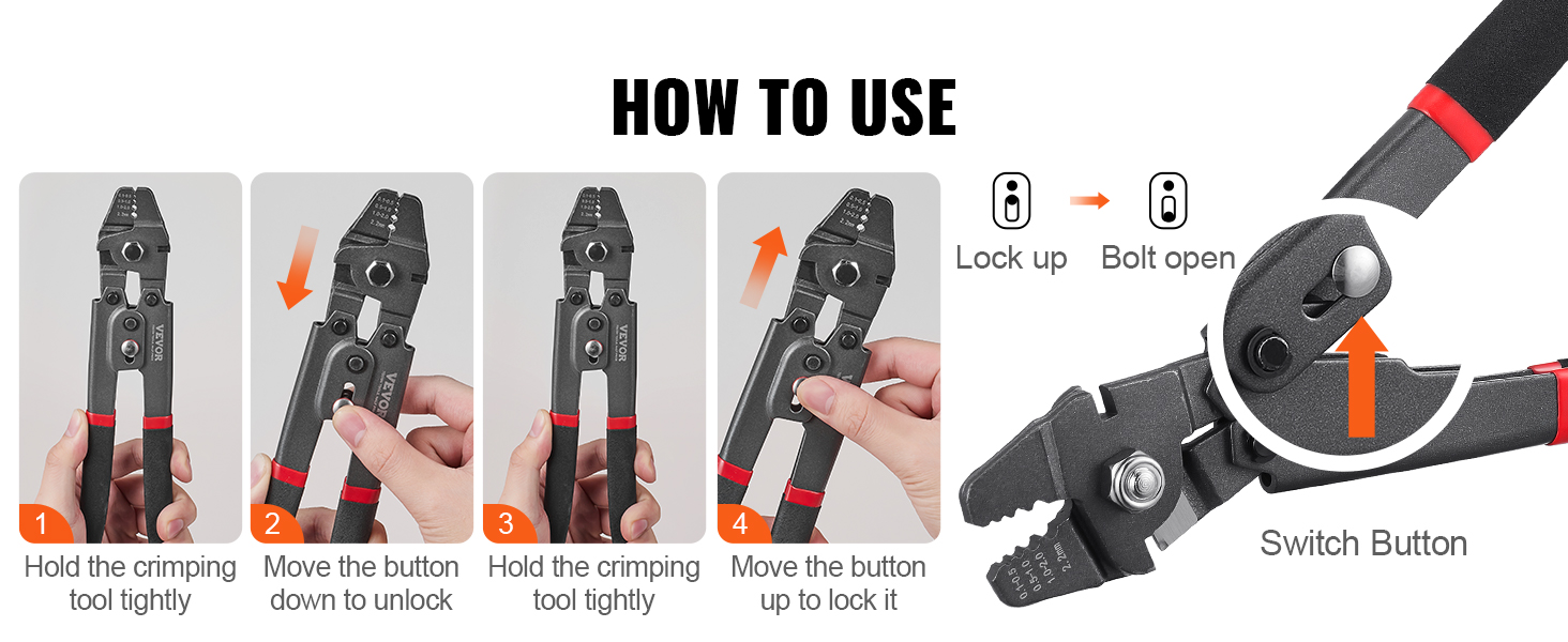 Equipped with a lock/open switch, simply unlock the switch, insert the wire rope into the hole, and press to crimp. You will obtain a perfect sleeve effortlessly.