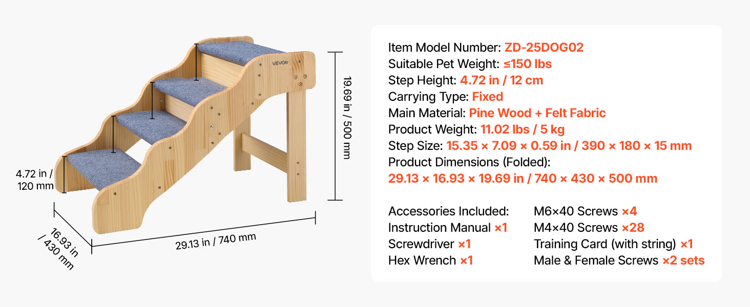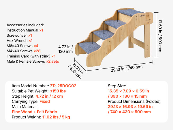 - Sturdy and Secure Support: The dog stairs is built with a strong wooden frame that supports pets up to 150 lbs (68 kg). Large screws add stability, and non-slip rubber pads on the bottom avoid wobbling while helping pets climb securely