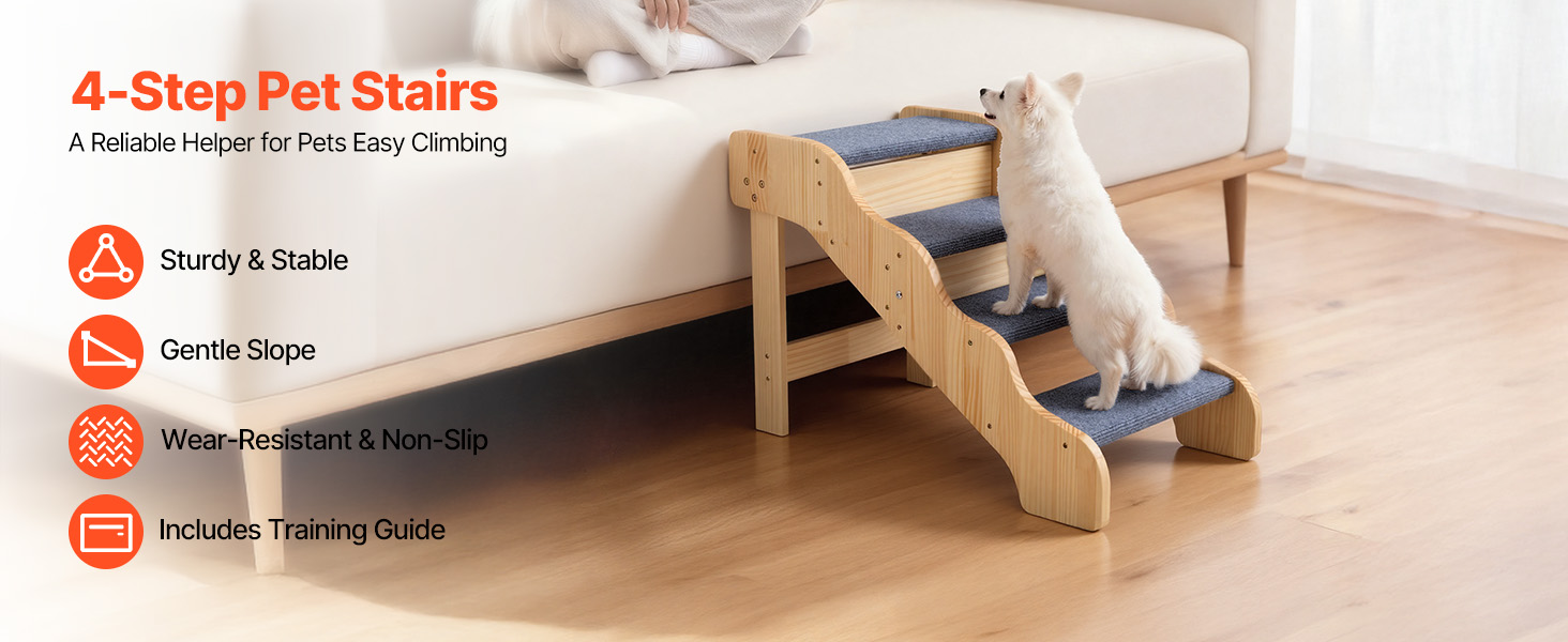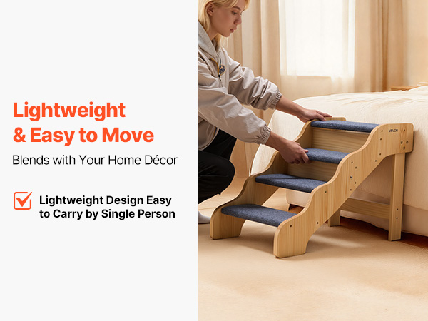 The 4-step design assists pets of all sizes, especially seniors, injured pets, or those with limited mobility, to reach beds and sofas securely. The sturdy structure offers support, while the lightweight build allows easy moving. Its clean, simple design blends seamlessly with any home decor