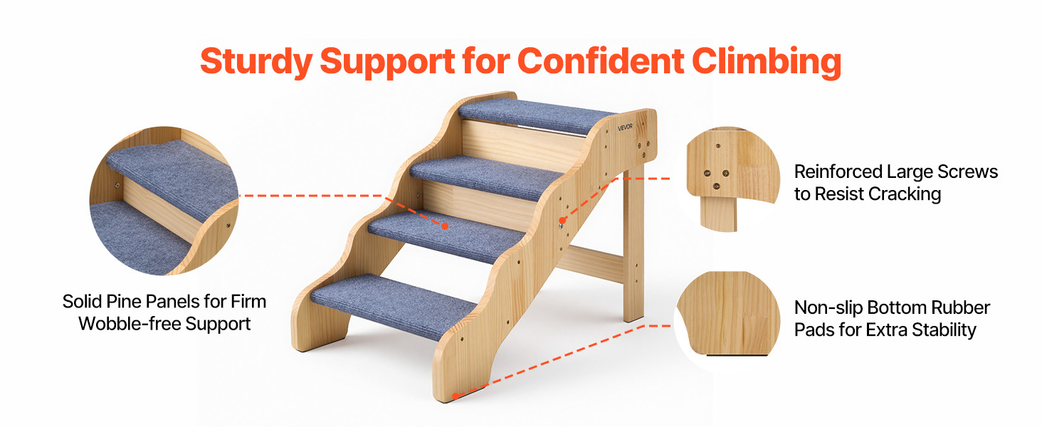 Pine wood boards with large screws provide durable support and reduce wobbling so pets can climb with confidence.