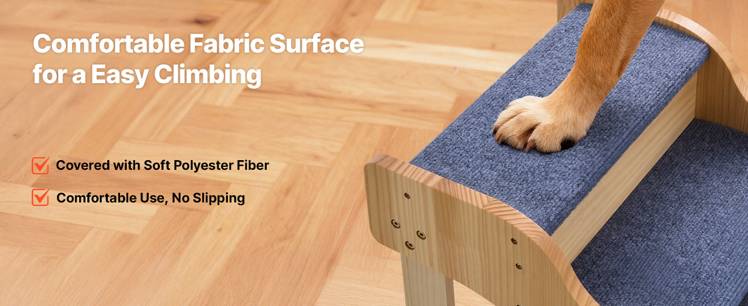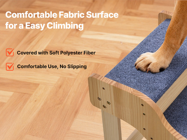 - Comfortable, Non-Slip Surface: The dog stairs for bed feature a soft polyester fabric cover that provides excellent traction for paws. It helps pets walk securely, avoids slipping, and makes climbing easier for your pets