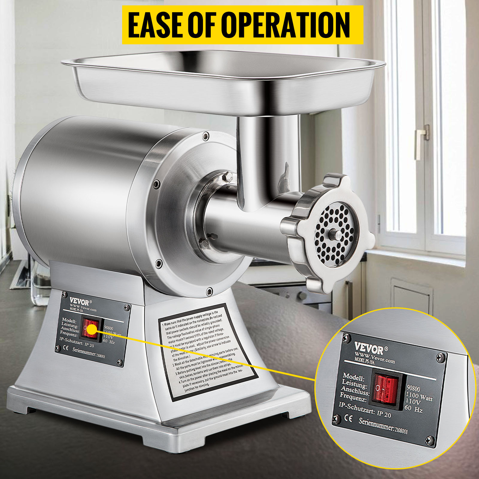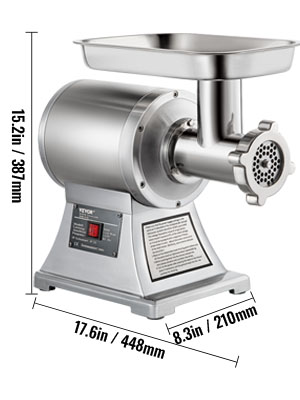 • Well-designed Details: A meat pusher is included for convenient stuffing of meat. Two grinding plates (6 mm, 8 mm) are also included. The 6 mm grinding plate is mounted on the machine; the 8 mm plate is provided for coarse or fine grinding. Voltage: 110V / 60Hz. Blade speed: 550LB/H. Motor power: 1100W. Processing capacity: 550 lbs of meat per hour. Cutting speed: 225RPM.