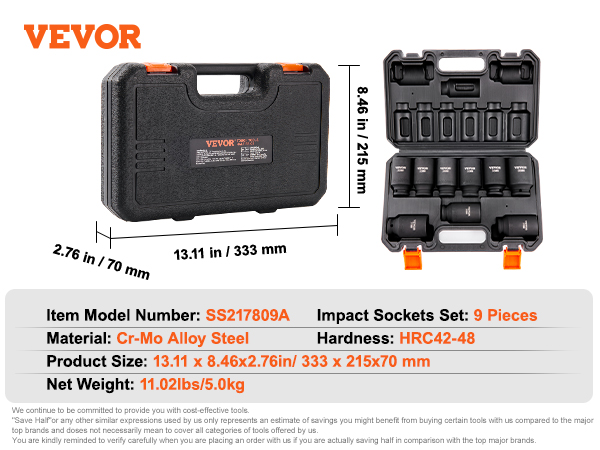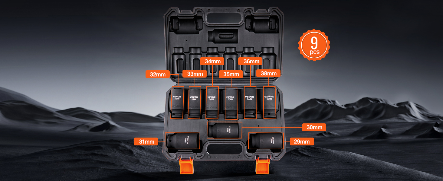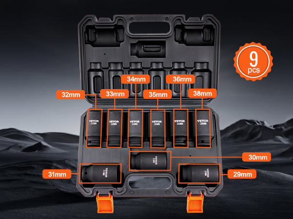 Are you looking for a professional and portable set of impact sockets? VEVOR’s 9-piece impact socket set offers a complete range of tools, especially suitable for repairing different brands of automobiles.