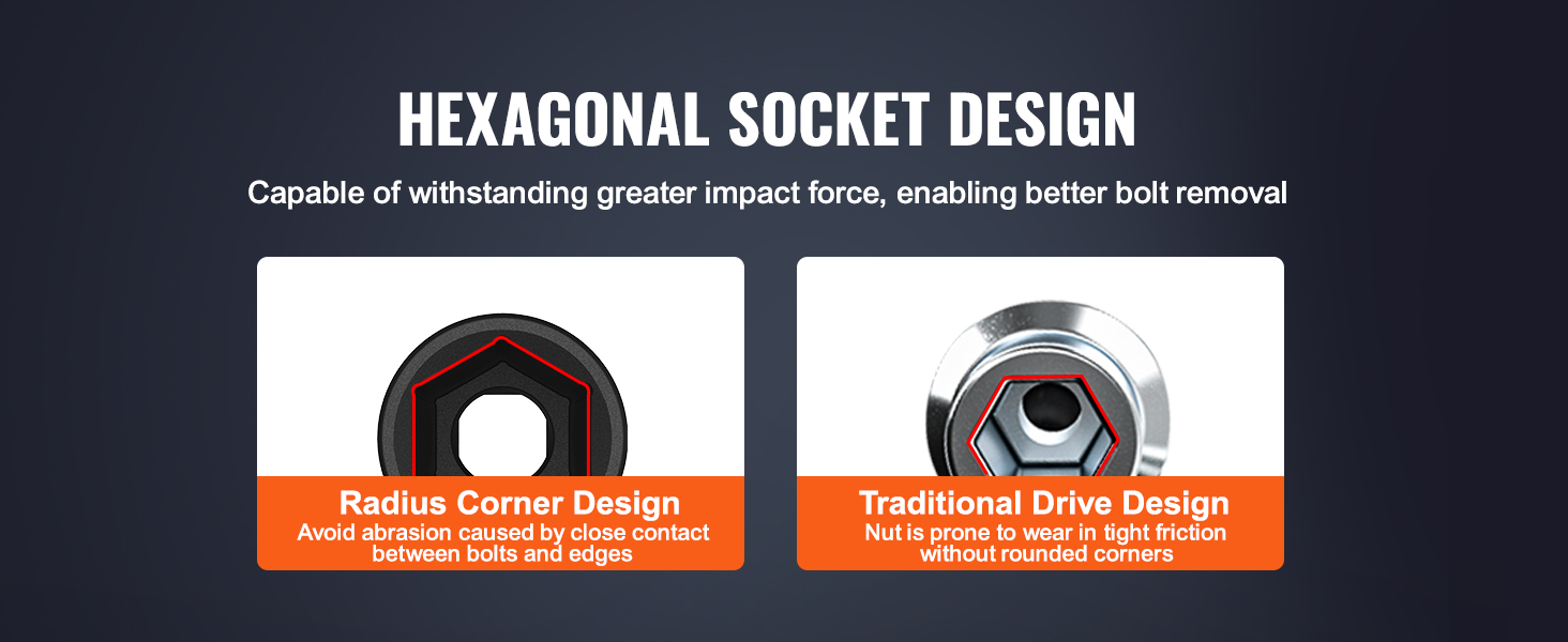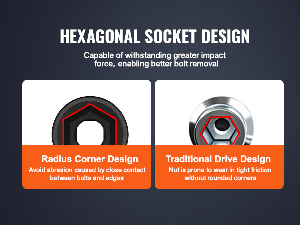 The hexagonal socket design creates a gap between the nut and the edges during operation, preventing excessive friction and wear. It can withstand greater impact force and effectively remove bolts.