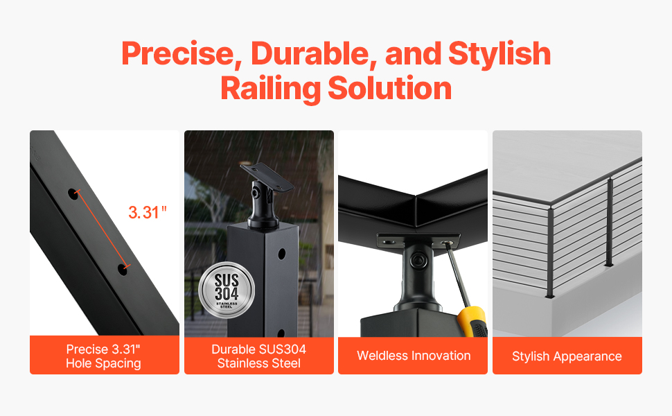Our cable railing system is made from high-quality SUS304 stainless steel, featuring 3″ hole spacing that complies with building codes. It is non-welded with a black finish, making it stylish and versatile for various settings.