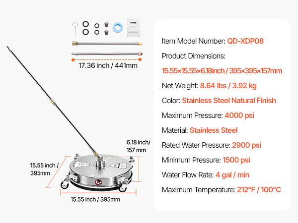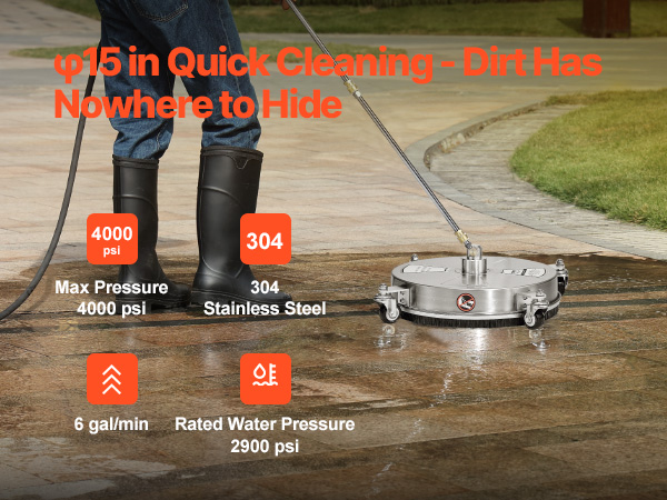 - φ15 Inch Fast & Efficient Cleaning: With a high flow rate of 4 gal/min, this φ15-inch pressure washer surface cleaner ensures uniform coverage, leaving no spot behind. Whether it's a big task or regular cleaning, it makes the job easy. Enjoy efficient cleaning while saving time and effort.