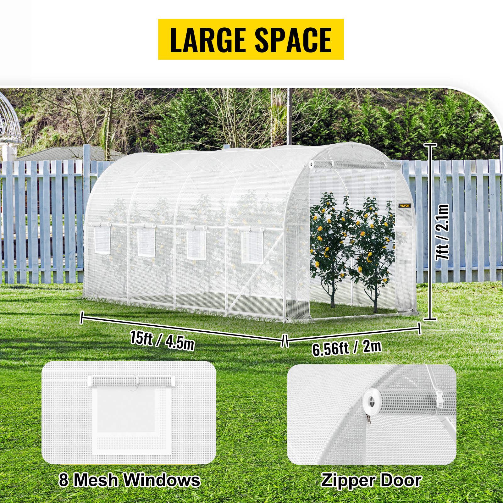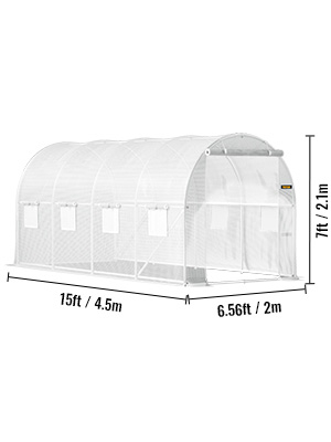 Size: 15 x 6.5 x 7 ft / 4.5 x 2 x 2.1 m. Our tunnel greenhouse has a large storage space with one door and 8 mesh windows to increase air flow for plants to thrive.