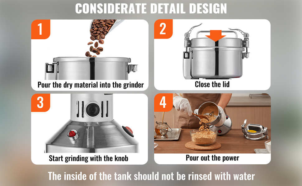 - Do not rinse the grinding chamber with water; clean with a dry cloth or brush only.