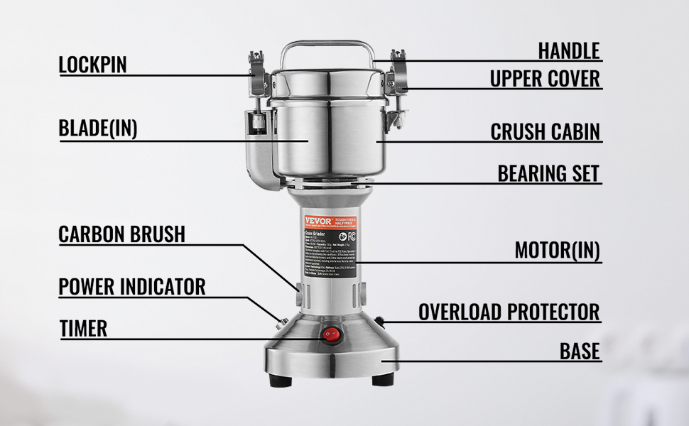 - Three-layer blade configuration: crushing blade, horn blade, powder removal blade. Grinds all types of dehydrated food into fine powder in as little as 30 seconds.