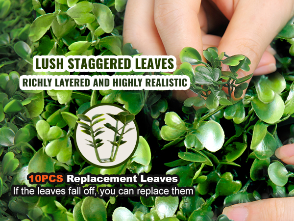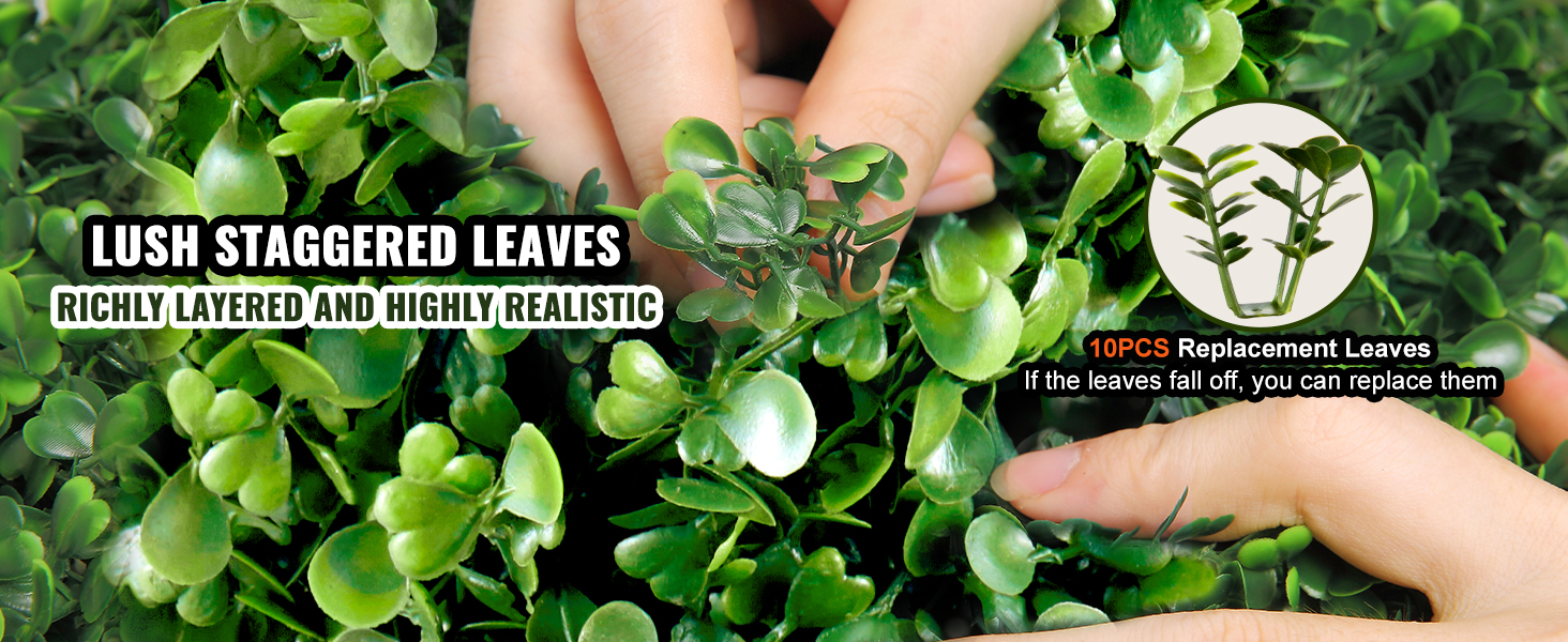 - Realistic and Lush: The staggered leaves enhance visual appeal and realism while requiring minimal upkeep. They do not require watering, trimming, or fertilizing. The densely arranged leaves effectively conceal the inner framework of the topiary, ensuring a seamless and cohesive appearance.