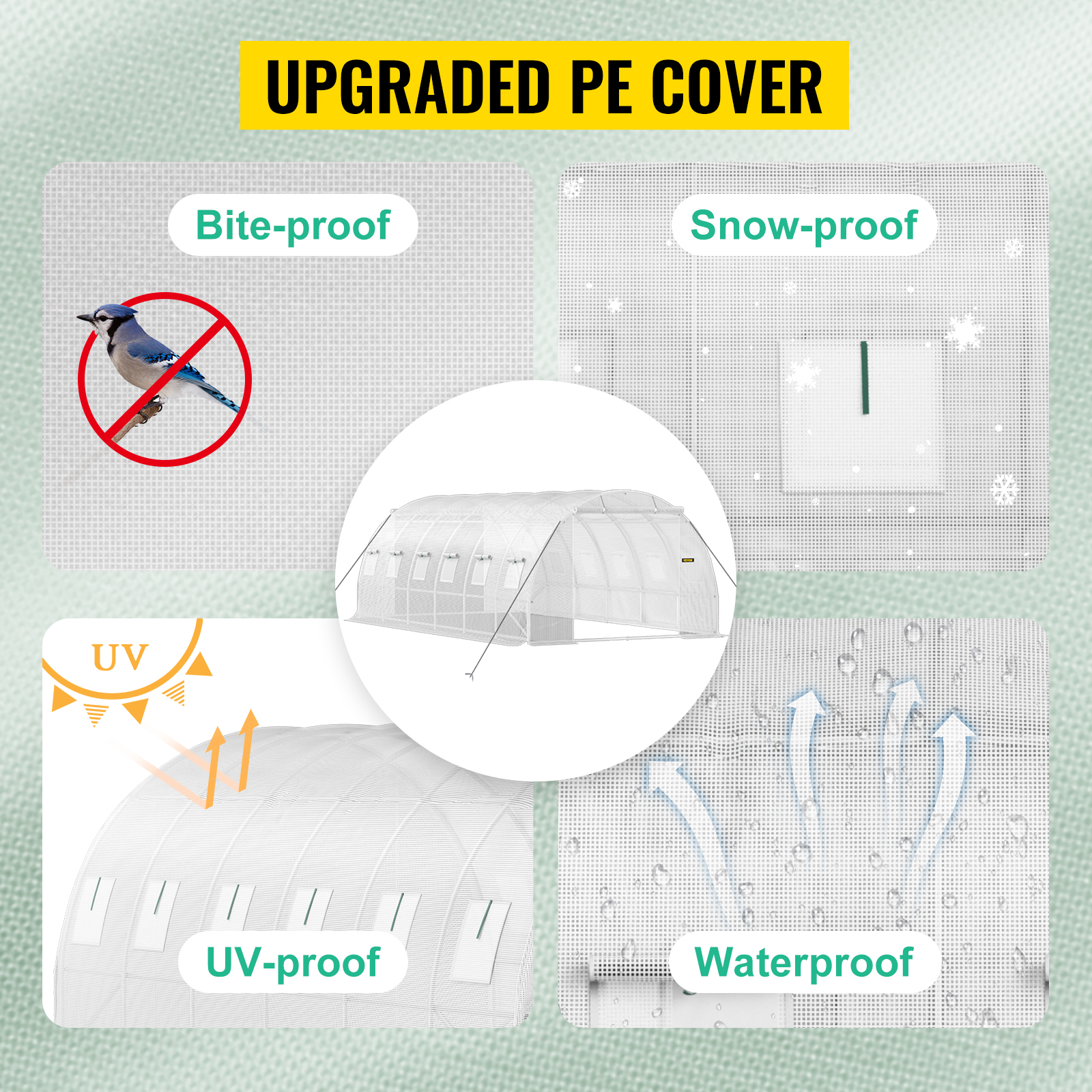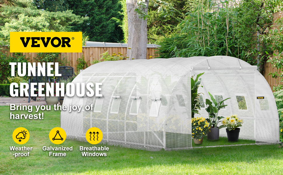 If you are looking for an outstanding greenhouse for your beloved plants or flowers, VEVOR can meet your demands. Our tunnel greenhouse has a reinforced galvanized structure with 3 top beams and 4 diagonal poles to ensure stability. Moreover, the PE cover is also waterproof, bite-proof and snow-proof. Are you ready to create the optimal environment for your plants and flowers to flourish and thrive? Treat your plants right and watch them grow!