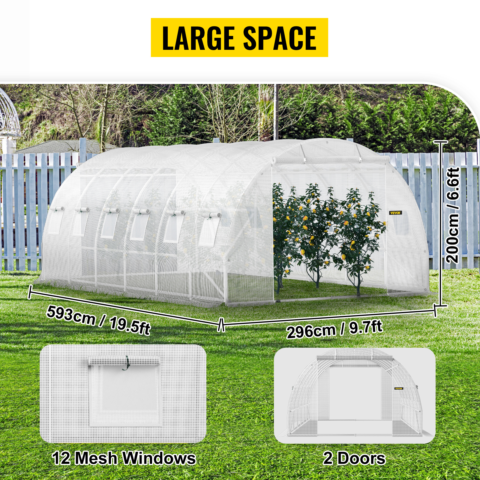 Size: 20 x 10 x 7 ft / 6.1 x 3 x 2.1 m. Our tunnel greenhouse has a large storage space with 2 doors and 12 mesh windows to increase air flow for plants to thrive.
