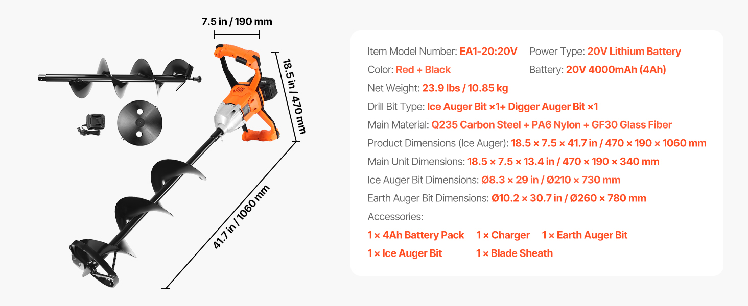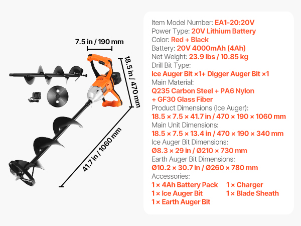 | Product Dimensions (Ice Auger) | 18.5 × 7.5 × 41.7 in / 470 × 190 × 1060 mm |