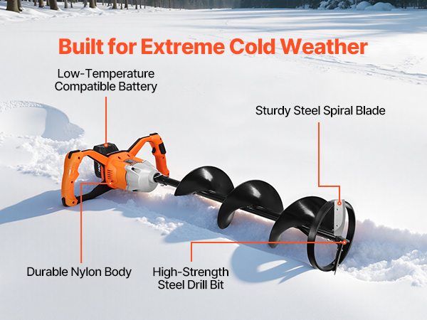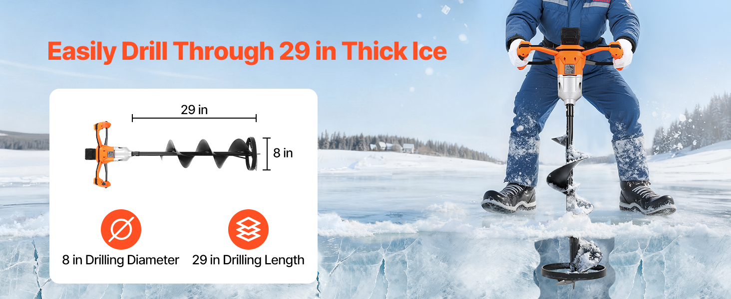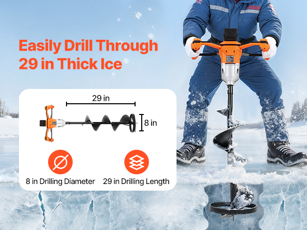 - Efficient Ice Penetration: Ice auger length: 31.5 in/800 mm, diameter: 8 in/203 mm. Equipped with low-temperature resistant, impact-proof steel spiral blades and sharp steel drill bits, this electric ice auger quickly penetrates hard ice, making it suitable for ice fishing, ice surveys, or rescue operations