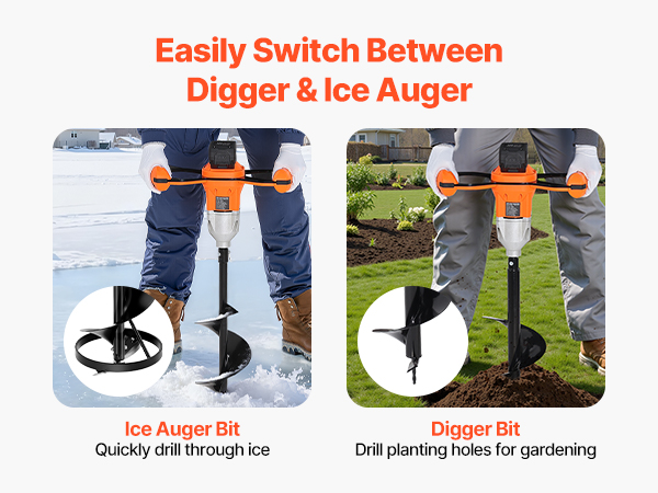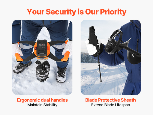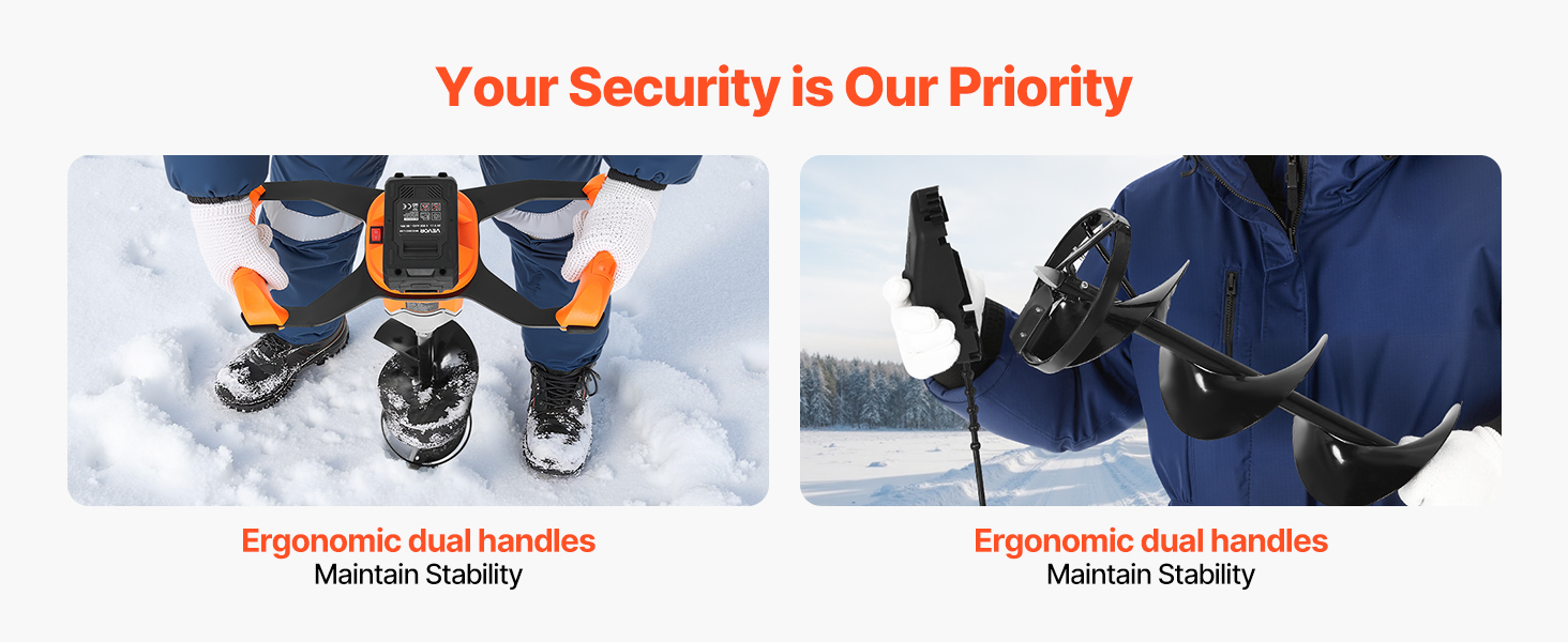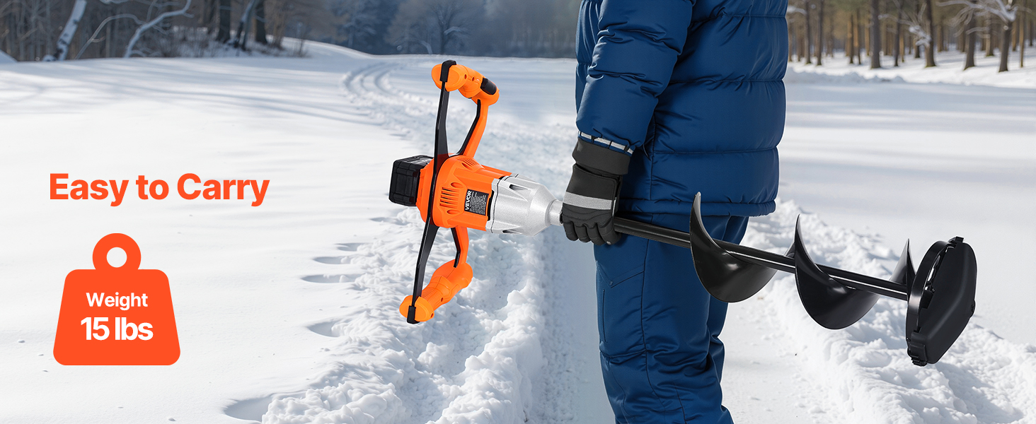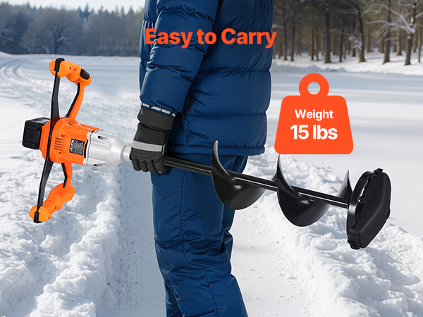 - Easy to Use: This power ice auger is easy to use, even for beginners. Press the safety lock, then pull the trigger to start drilling. Ergonomic dual side handles provide stability and reduce fatigue during use.