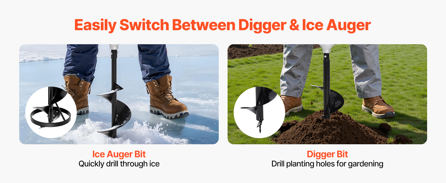 - 2-in-1 Multi-Purpose: Our ice drill auger set includes 1 ice auger bit and 1 earth auger bit for versatile use. Ideal for winter ice fishing and off-season gardening tasks like soil aeration or planting, offering year-round utility