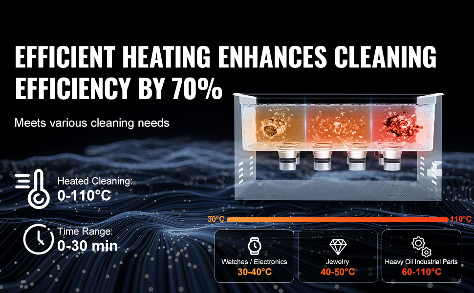 - Heated Cleaning: For jewelry, watches/electronic accessories, and heavy grease industrial components, control cleaning temperature from 0–110°C to accelerate dirt dissolution. This delivers more efficient, targeted cleaning. High-temperature mode rapidly breaks down stubborn grease; low-temperature mode gently protects sensitive materials.