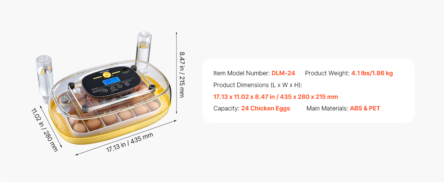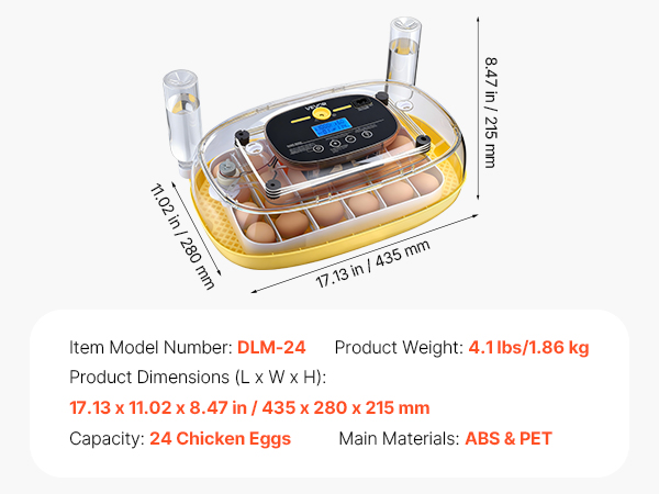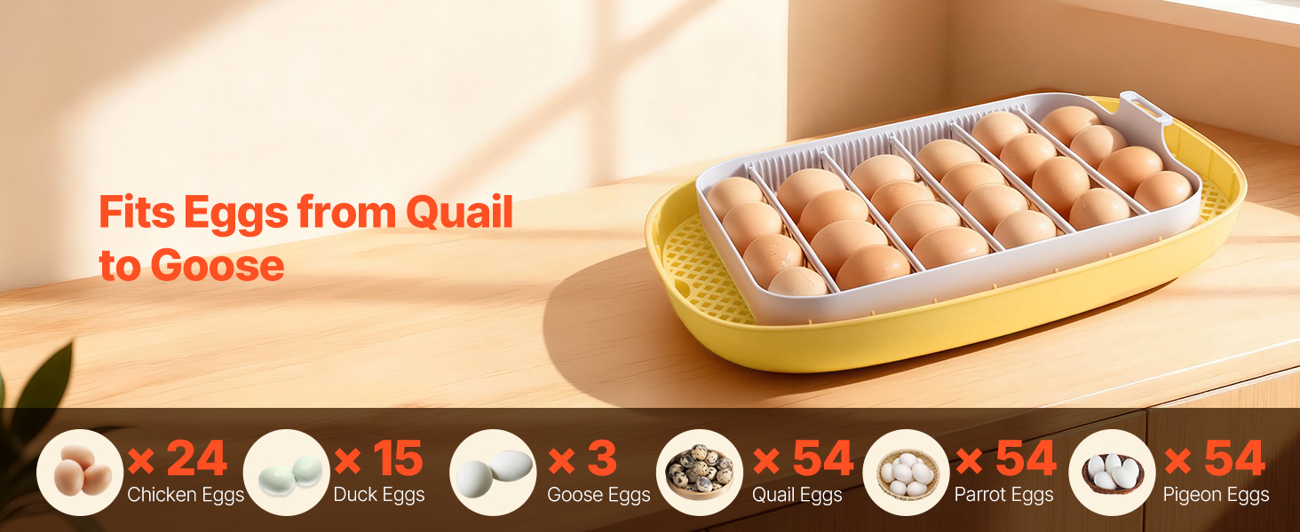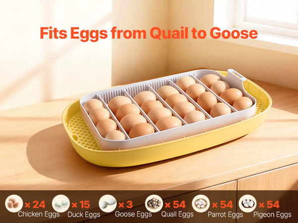 - Adjustable Egg Spacing: Designed to accommodate various egg types, this duck egg incubator can hold up to 24 chicken eggs, 15 duck eggs, 3 goose eggs, or 54 smaller eggs, such as quail eggs.