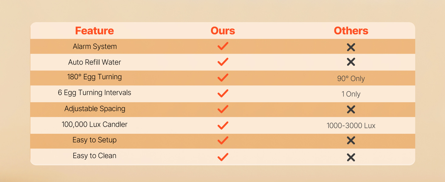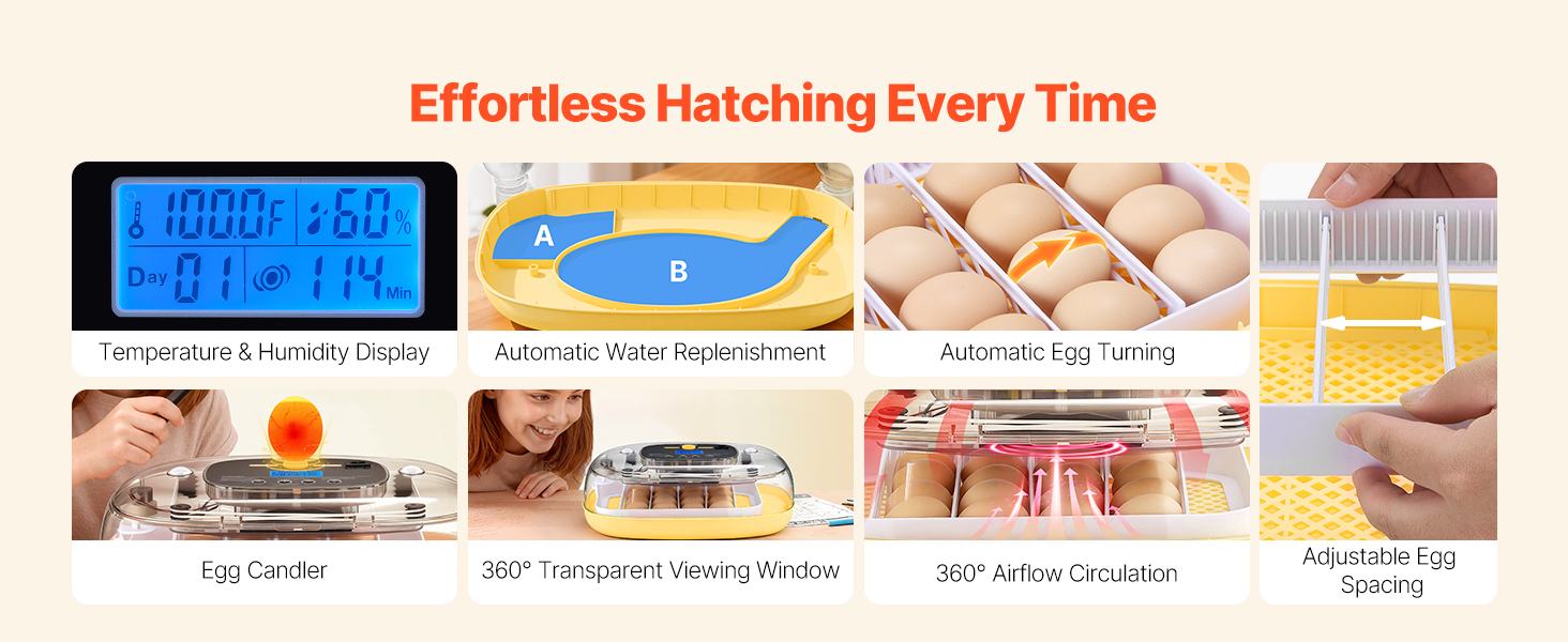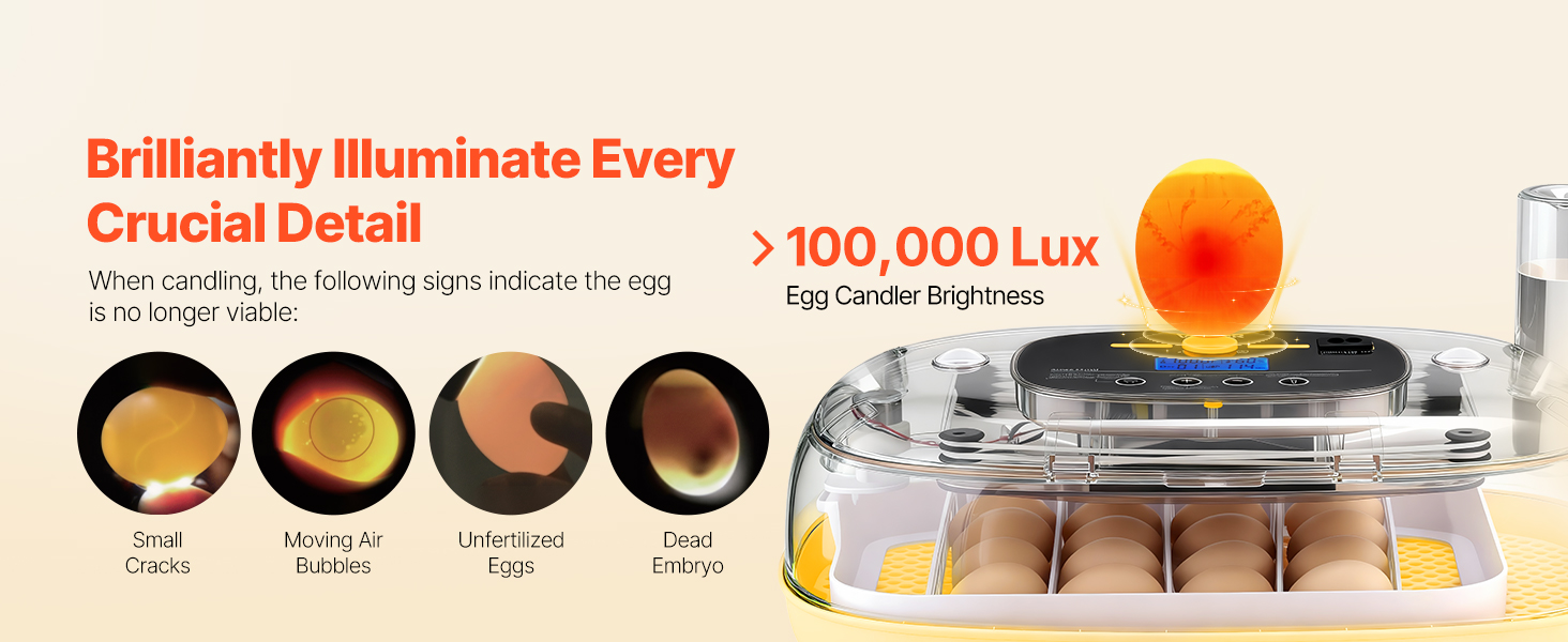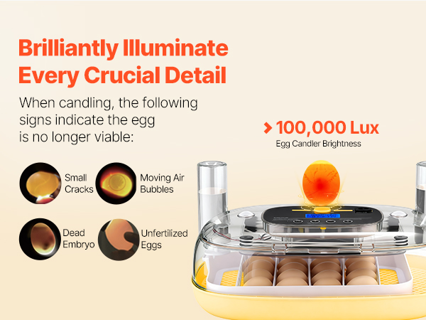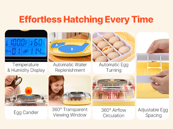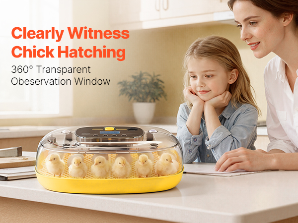 - Egg Candler & 360° Viewing Window: Our automatic egg turner features a 10W Lux high-brightness egg candler for easy embryo inspection. The 360° transparent viewing window allows the entire family to witness the hatching process.