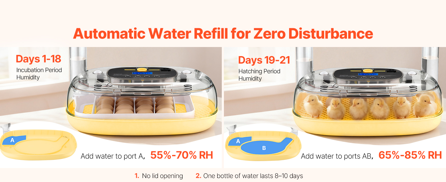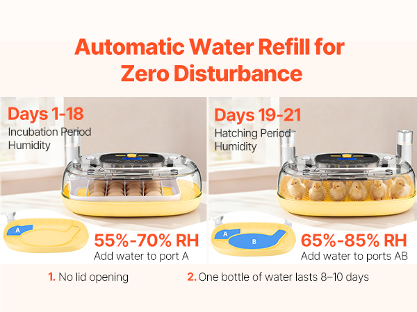 - Automatic Water Refill: The egg incubator includes an AB dual-zone auto refill system, allowing you to add water without opening the lid. One bottle lasts 8–10 days, minimizing manual refills and easily maintaining ideal humidity.