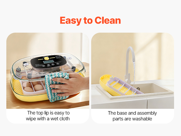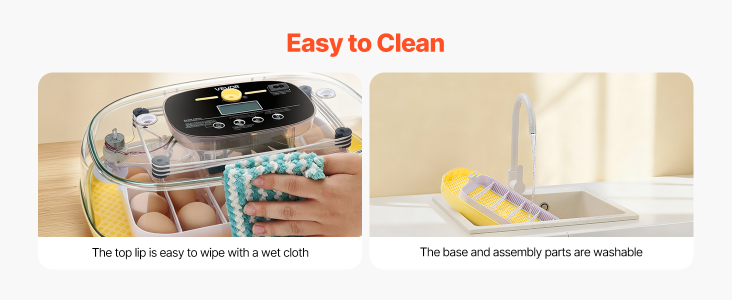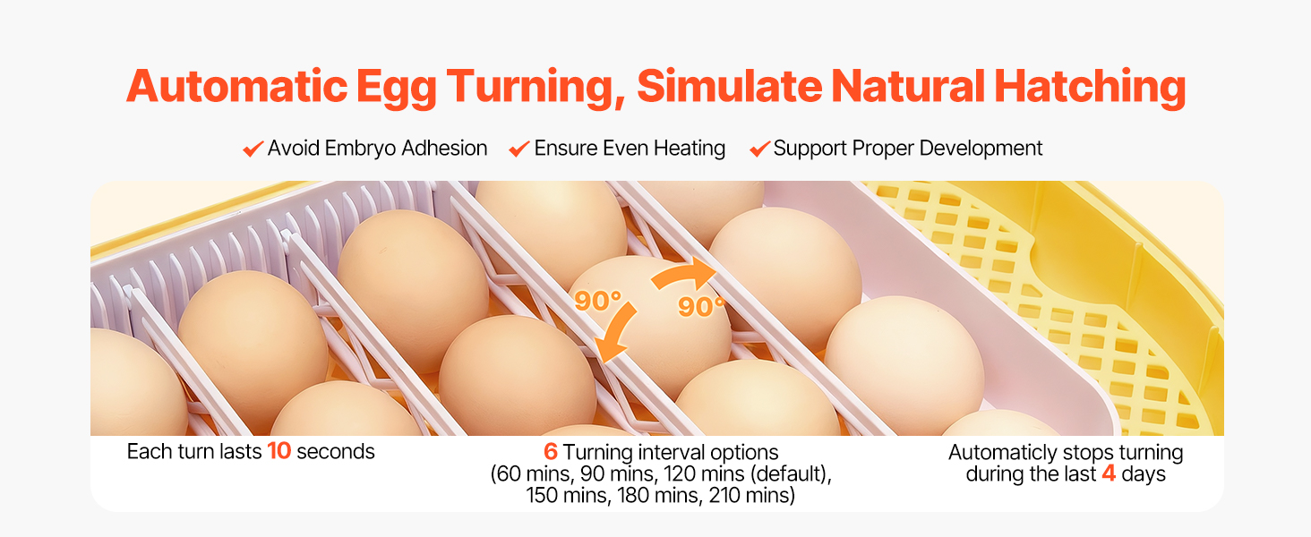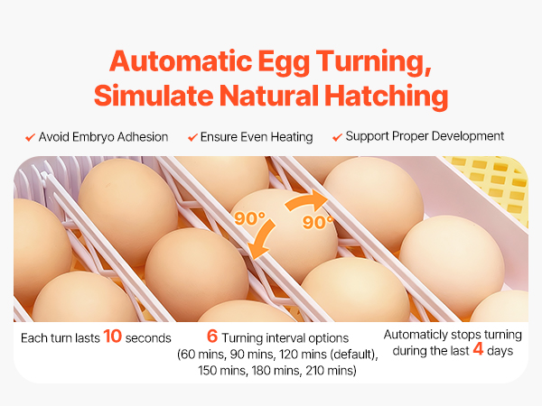 - 180° Automatic Egg Turning (One Turn): Designed to mimic a mother hen's gentle care, this egg hatching incubator gently turns eggs automatically with six selectable intervals, each lasting 10 seconds. It avoids embryo adhesion while ensuring even heating